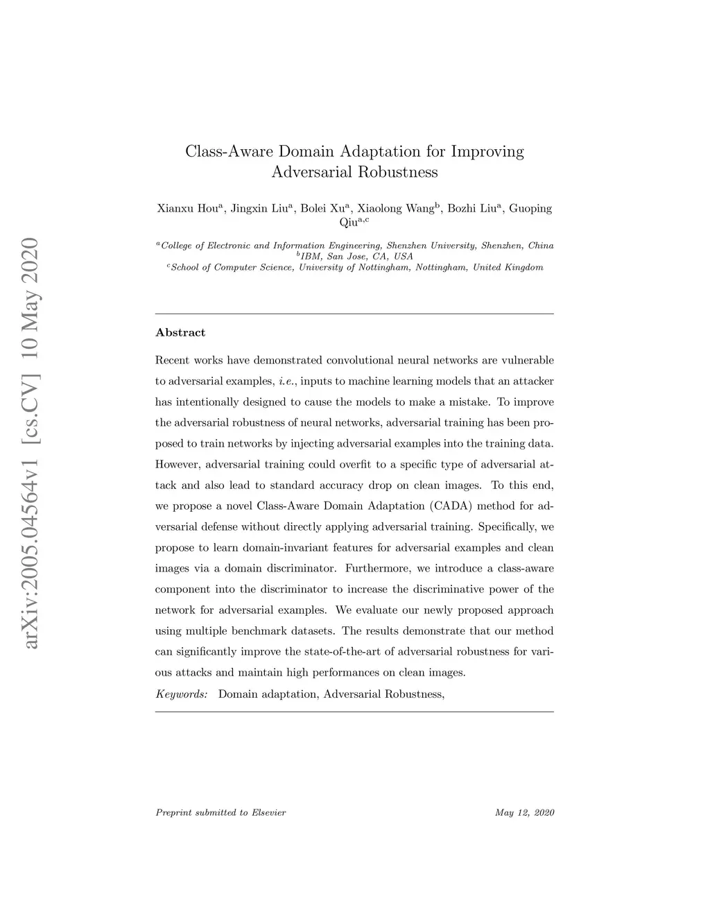 Recent works have demonstrated convolutional neural networks are vulnerable to adversarial examples, i.e., inputs to machine learning models that an attacker has intentionally designed to cause the models to make a mistake. To improve the adversarial robustness of neural networks, adversarial training has been proposed to train networks by injecting adversarial examples into the training data. However, adversarial training could overfit to a specific type of adversarial attack and also lead to standard accuracy drop on clean images. To this end, we propose a novel Class-Aware Domain Adaptation (CADA) method for adversarial defense without directly applying adversarial training. Specifically, we propose to learn domain-invariant features for adversarial examples and clean images via a domain discriminator. Furthermore, we introduce a class-aware component into the discriminator to increase the discriminative power of the network for adversarial examples. We evaluate our newly proposed approach using multiple benchmark datasets. The results demonstrate that our method can significantly improve the state-of-the-art of adversarial robustness for various attacks and maintain high performances on clean images.