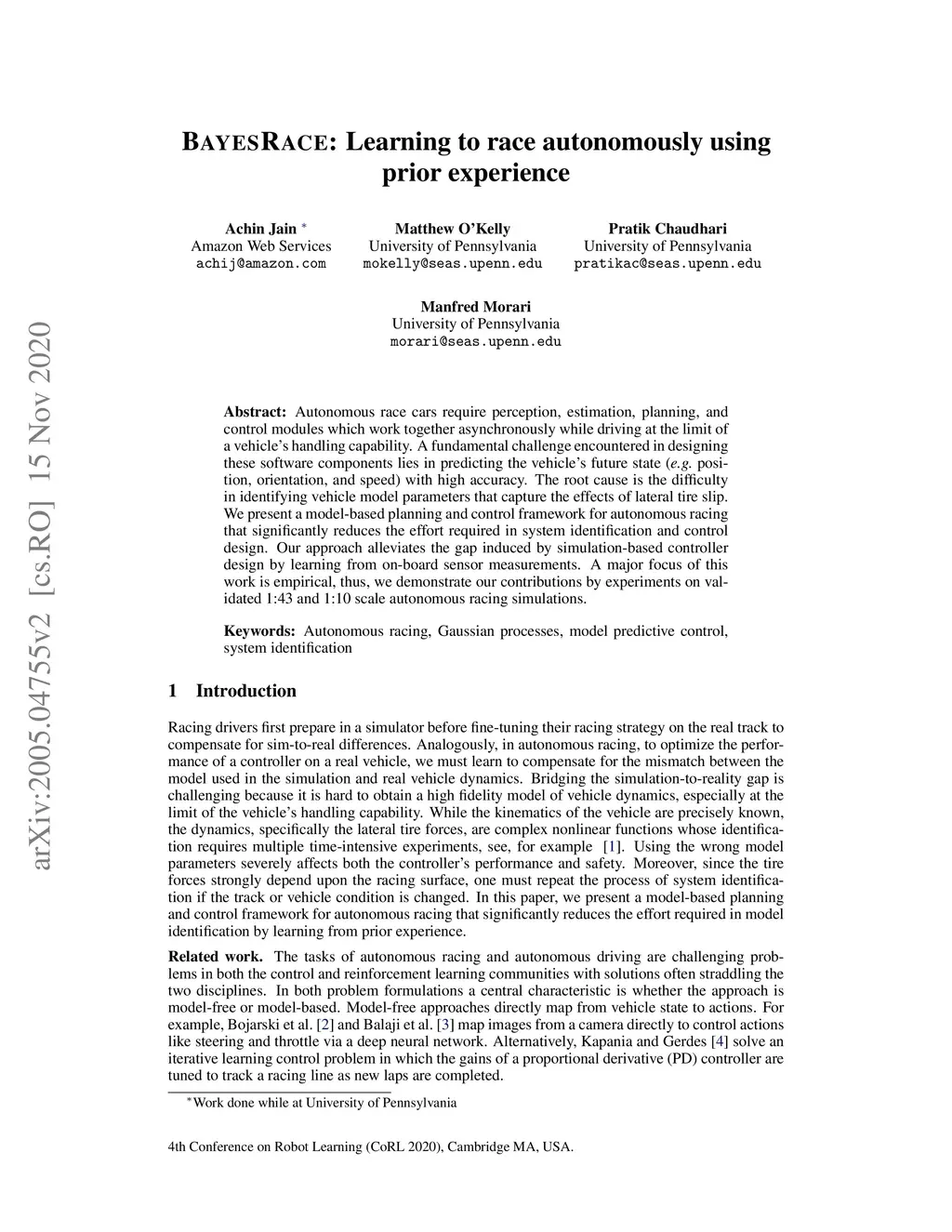 BayesRace: Learning to race autonomously using prior experience