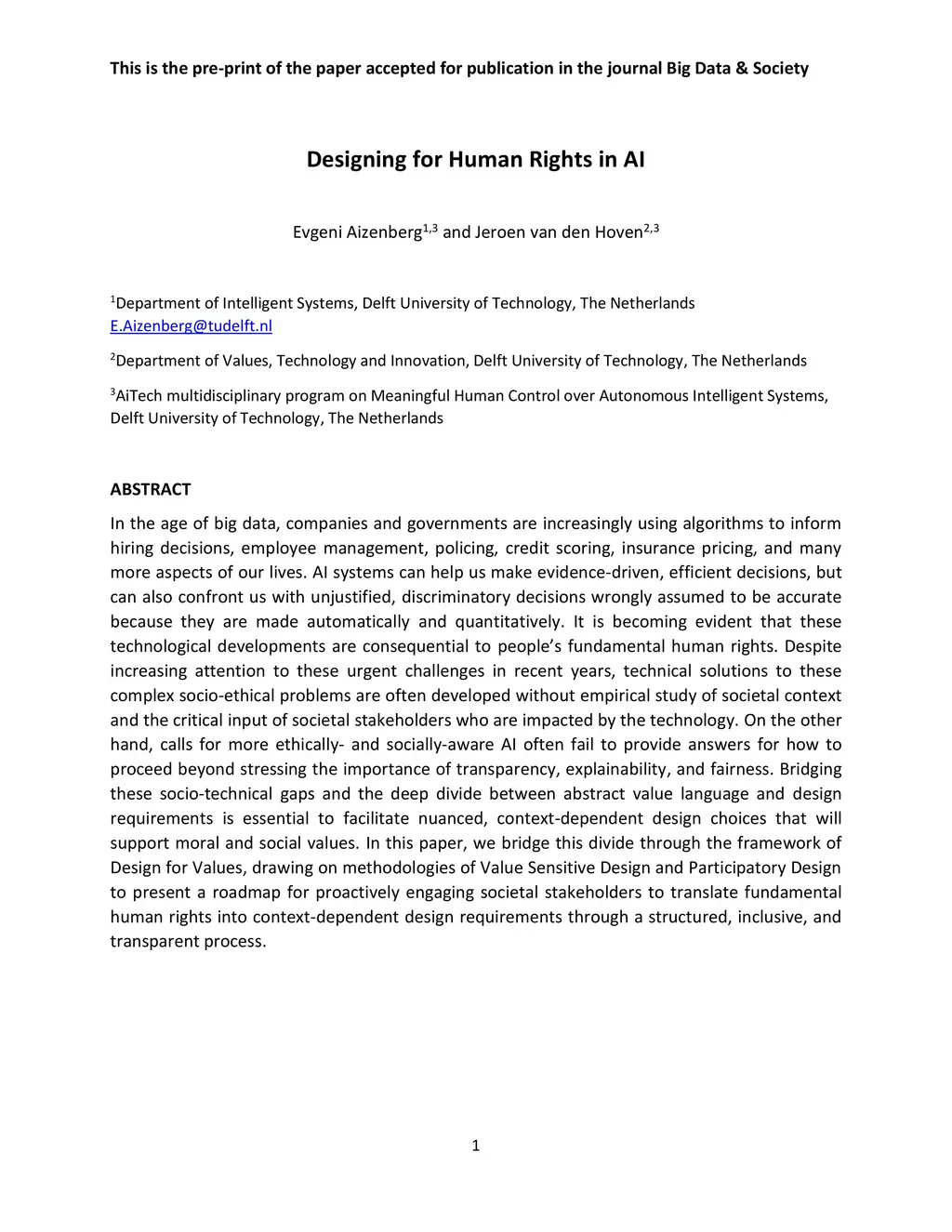 In the age of big data, companies and governments are increasingly using algorithms to inform hiring decisions, employee management, policing, credit scoring, insurance pricing, and many more aspects of our lives. AI systems can help us make evidence-driven, efficient decisions, but can also confront us with unjustified, discriminatory decisions wrongly assumed to be accurate because they are made automatically and quantitatively. It is becoming evident that these technological developments are consequential to people's fundamental human rights. Despite increasing attention to these urgent challenges in recent years, technical solutions to these complex socio-ethical problems are often developed without empirical study of societal context and the critical input of societal stakeholders who are impacted by the technology. On the other hand, calls for more ethically- and socially-aware AI often fail to provide answers for how to proceed beyond stressing the importance of transparency, explainability, and fairness. Bridging these socio-technical gaps and the deep divide between abstract value language and design requirements is essential to facilitate nuanced, context-dependent design choices that will support moral and social values. In this paper, we bridge this divide through the framework of Design for Values, drawing on methodologies of Value Sensitive Design and Participatory Design to present a roadmap for proactively engaging societal stakeholders to translate fundamental human rights into context-dependent design requirements through a structured, inclusive, and transparent process.