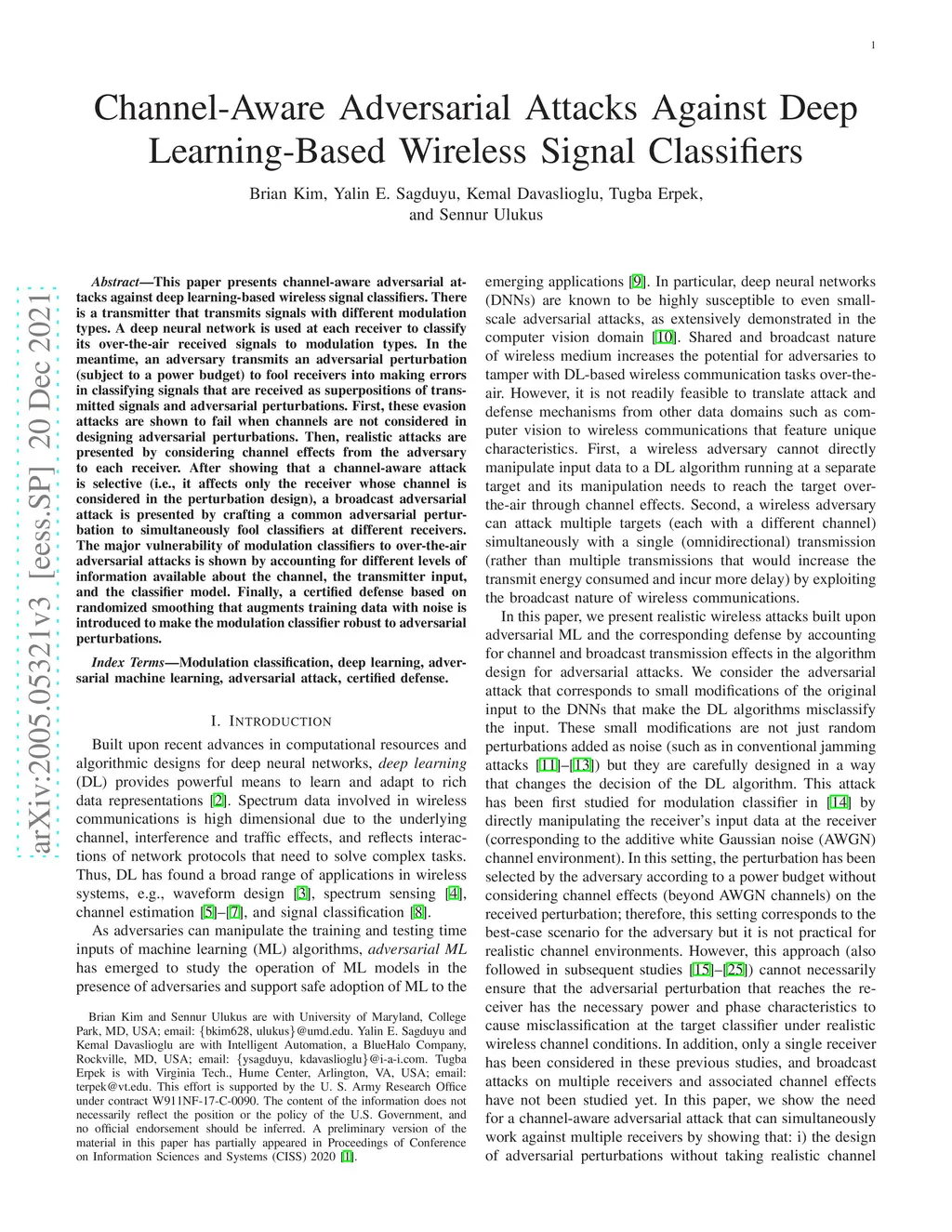 This paper presents channel-aware adversarial attacks against deep learning-based wireless signal classifiers. There is a transmitter that transmits signals with different modulation types. A deep neural network is used at each receiver to classify its over-the-air received signals to modulation types. In the meantime, an adversary transmits an adversarial perturbation (subject to a power budget) to fool receivers into making errors in classifying signals that are received as superpositions of transmitted signals and adversarial perturbations. First, these evasion attacks are shown to fail when channels are not considered in designing adversarial perturbations. Then, realistic attacks are presented by considering channel effects from the adversary to each receiver. After showing that a channel-aware attack is selective (i.e., it affects only the receiver whose channel is considered in the perturbation design), a broadcast adversarial attack is presented by crafting a common adversarial perturbation to simultaneously fool classifiers at different receivers. The major vulnerability of modulation classifiers to over-the-air adversarial attacks is shown by accounting for different levels of information available about the channel, the transmitter input, and the classifier model. Finally, a certified defense based on randomized smoothing that augments training data with noise is introduced to make the modulation classifier robust to adversarial perturbations.