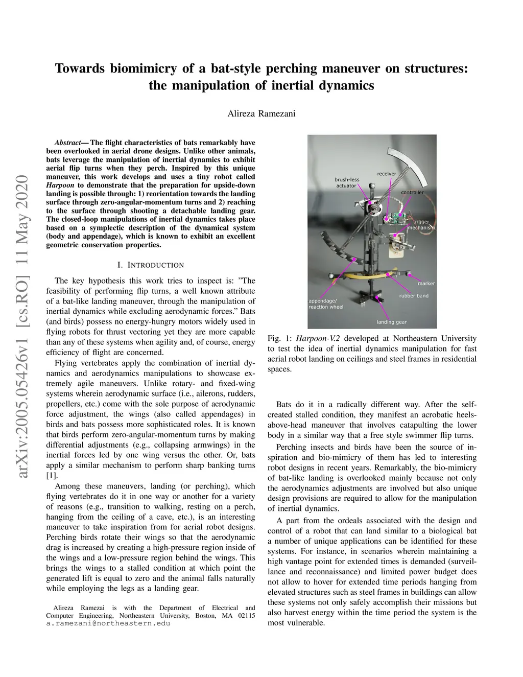 The flight characteristics of bats remarkably have been overlooked in aerial drone designs. Unlike other animals, bats leverage the manipulation of inertial dynamics to exhibit aerial flip turns when they perch. Inspired by this unique maneuver, this work develops and uses a tiny robot called \textit{Harpoon} to demonstrate that the preparation for upside-down landing is possible through: 1) reorientation towards the landing surface through zero-angular-momentum turns and 2) reaching to the surface through shooting a detachable landing gear. The closed-loop manipulations of inertial dynamics takes place based on a symplectic description of the dynamical system (body and appendage), which is known to exhibit an excellent geometric conservation properties.
