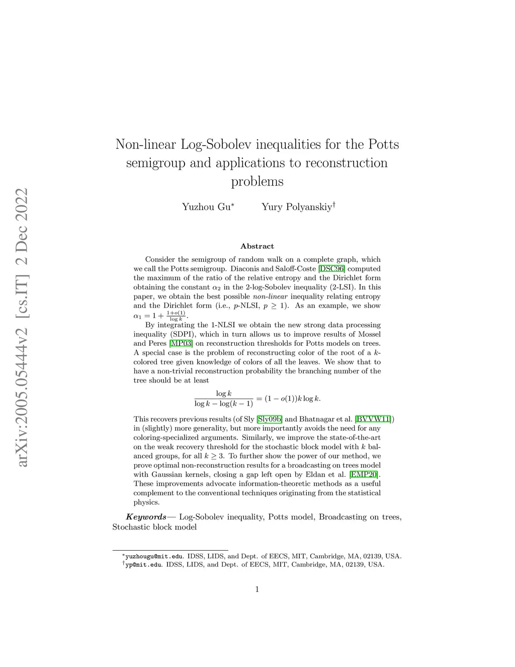 Consider the semigroup of random walk on a complete graph, which we call the Potts semigroup. Diaconis and Saloff-Coste computed the maximum of the ratio of the relative entropy and the Dirichlet form obtaining the constant in the -log-Sobolev inequality (-LSI). In this paper, we obtain the best possible non-linear inequality relating entropy and the Dirichlet form (i.e., -NLSI, ). As an example, we show . By integrating the -NLSI we obtain the new strong data processing inequality (SDPI), which in turn allows us to improve results of Mossel and Peres on reconstruction thresholds for Potts models on trees. A special case is the problem of reconstructing color of the root of a -colored tree given knowledge of colors of all the leaves. We show that to have a non-trivial reconstruction probability the branching number of the tree should be at least This recovers previous results (of Sly and Bhatnagar et al.) in (slightly) more generality, but more importantly avoids the need for any coloring-specialized arguments. Similarly, we improve the state-of-the-art on the weak recovery threshold for the stochastic block model with balanced groups, for all . To further show the power of our method, we prove optimal non-reconstruction results for a broadcasting on trees model with Gaussian kernels, closing a gap left open by Eldan et al. These improvements advocate information-theoretic methods as a useful complement to the conventional techniques originating from the statistical physics.
