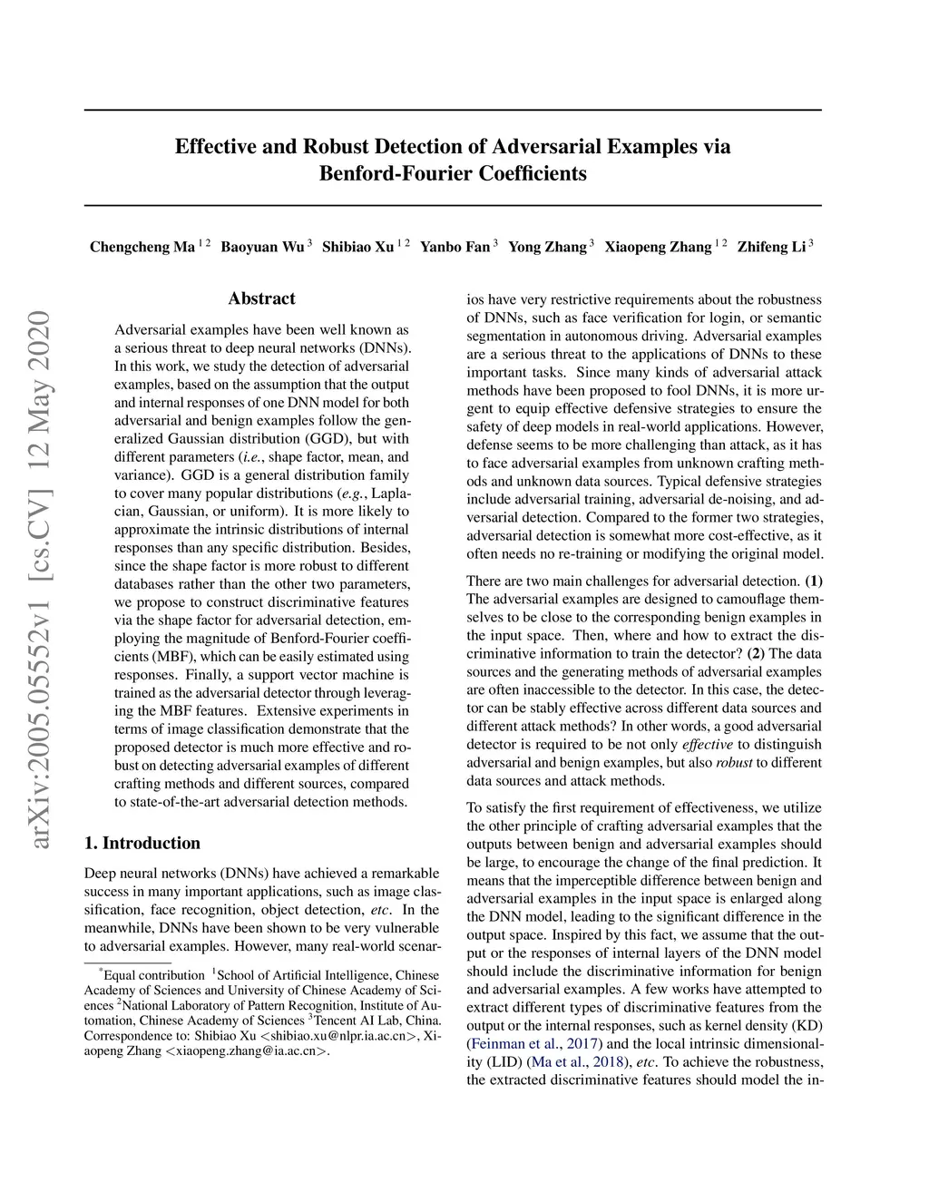 Adversarial examples have been well known as a serious threat to deep neural networks (DNNs). In this work, we study the detection of adversarial examples, based on the assumption that the output and internal responses of one DNN model for both adversarial and benign examples follow the generalized Gaussian distribution (GGD), but with different parameters (i.e., shape factor, mean, and variance). GGD is a general distribution family to cover many popular distributions (e.g., Laplacian, Gaussian, or uniform). It is more likely to approximate the intrinsic distributions of internal responses than any specific distribution. Besides, since the shape factor is more robust to different databases rather than the other two parameters, we propose to construct discriminative features via the shape factor for adversarial detection, employing the magnitude of Benford-Fourier coefficients (MBF), which can be easily estimated using responses. Finally, a support vector machine is trained as the adversarial detector through leveraging the MBF features. Extensive experiments in terms of image classification demonstrate that the proposed detector is much more effective and robust on detecting adversarial examples of different crafting methods and different sources, compared to state-of-the-art adversarial detection methods.