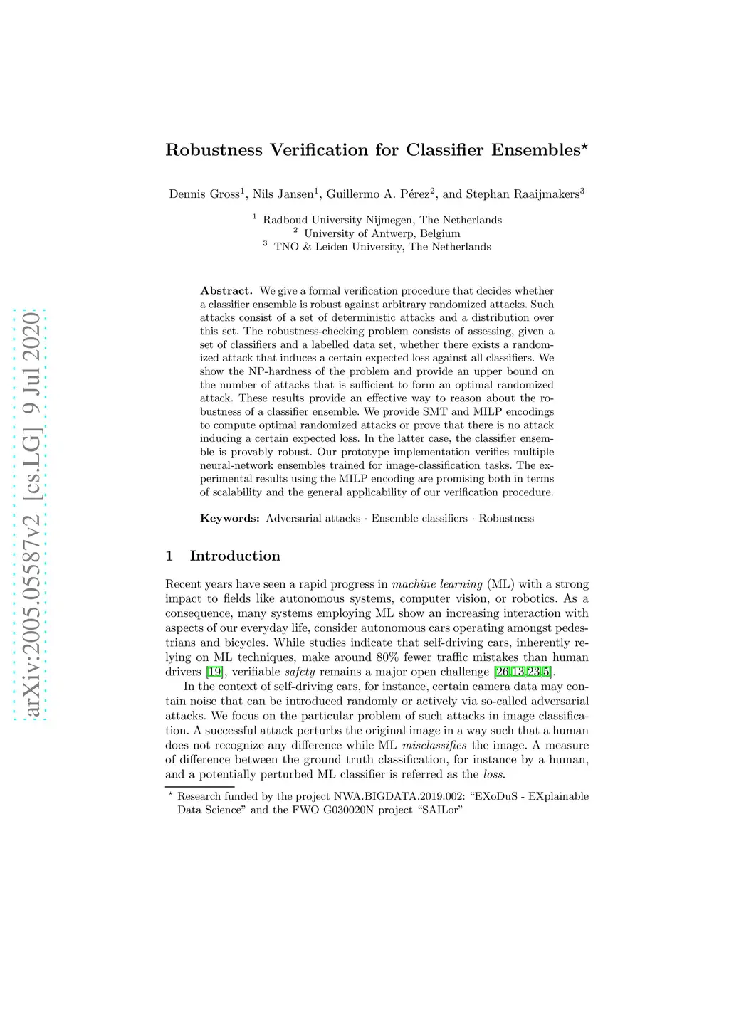 We give a formal verification procedure that decides whether a classifier ensemble is robust against arbitrary randomized attacks. Such attacks consist of a set of deterministic attacks and a distribution over this set. The robustness-checking problem consists of assessing, given a set of classifiers and a labelled data set, whether there exists a randomized attack that induces a certain expected loss against all classifiers. We show the NP-hardness of the problem and provide an upper bound on the number of attacks that is sufficient to form an optimal randomized attack. These results provide an effective way to reason about the robustness of a classifier ensemble. We provide SMT and MILP encodings to compute optimal randomized attacks or prove that there is no attack inducing a certain expected loss. In the latter case, the classifier ensemble is provably robust. Our prototype implementation verifies multiple neural-network ensembles trained for image-classification tasks. The experimental results using the MILP encoding are promising both in terms of scalability and the general applicability of our verification procedure.