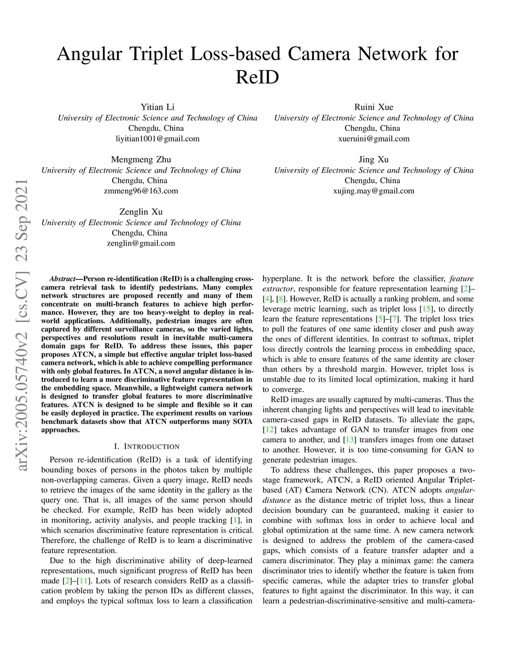 Person re-identification (ReID) is a challenging crosscamera retrieval task to identify pedestrians. Many complex network structures are proposed recently and many of them concentrate on multi-branch features to achieve high performance. However, they are too heavy-weight to deploy in realworld applications. Additionally, pedestrian images are often captured by different surveillance cameras, so the varied lights, perspectives and resolutions result in inevitable multi-camera domain gaps for ReID. To address these issues, this paper proposes ATCN, a simple but effective angular triplet loss-based camera network, which is able to achieve compelling performance with only global features. In ATCN, a novel angular distance is introduced to learn a more discriminative feature representation in the embedding space. Meanwhile, a lightweight camera network is designed to transfer global features to more discriminative features. ATCN is designed to be simple and flexible so it can be easily deployed in practice. The experiment results on various benchmark datasets show that ATCN outperforms many SOTA approaches.