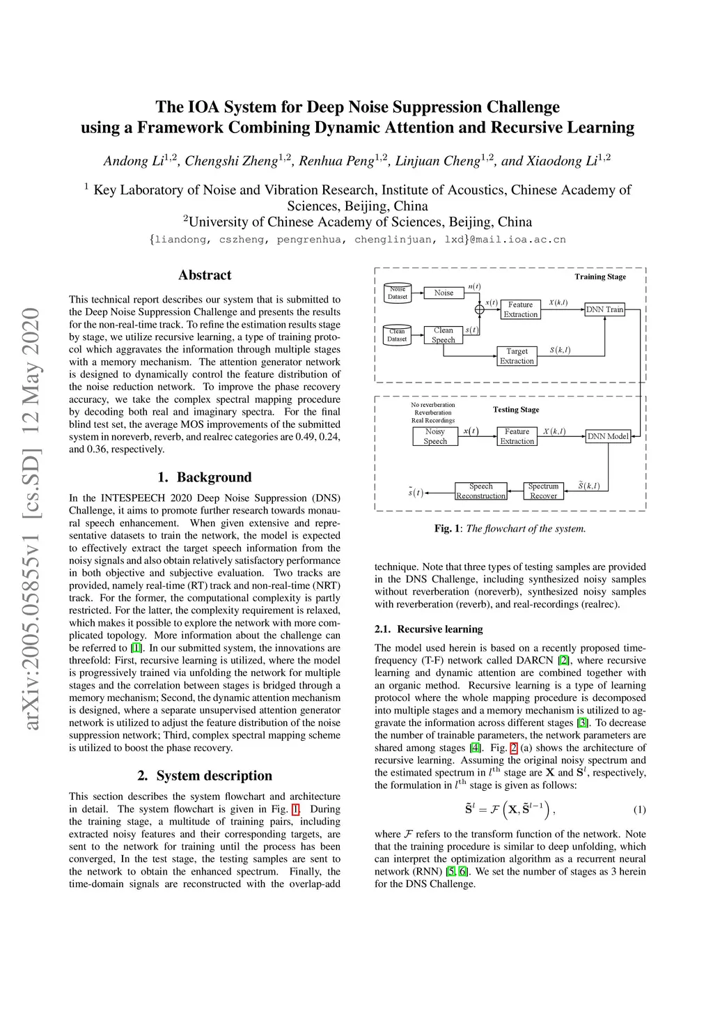 This technical report describes our system that is submitted to the Deep Noise Suppression Challenge and presents the results for the non-real-time track. To refine the estimation results stage by stage, we utilize recursive learning, a type of training protocol which aggravates the information through multiple stages with a memory mechanism. The attention generator network is designed to dynamically control the feature distribution of the noise reduction network. To improve the phase recovery accuracy, we take the complex spectral mapping procedure by decoding both real and imaginary spectra. For the final blind test set, the average MOS improvements of the submitted system in noreverb, reverb, and realrec categories are 0.49, 0.24, and 0.36, respectively.