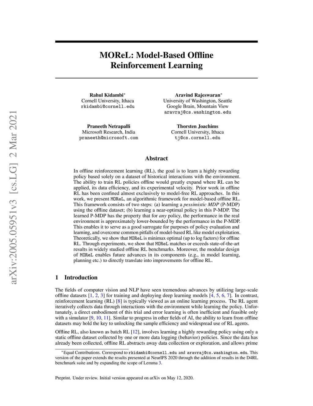 MOReL : Model-Based Offline Reinforcement Learning