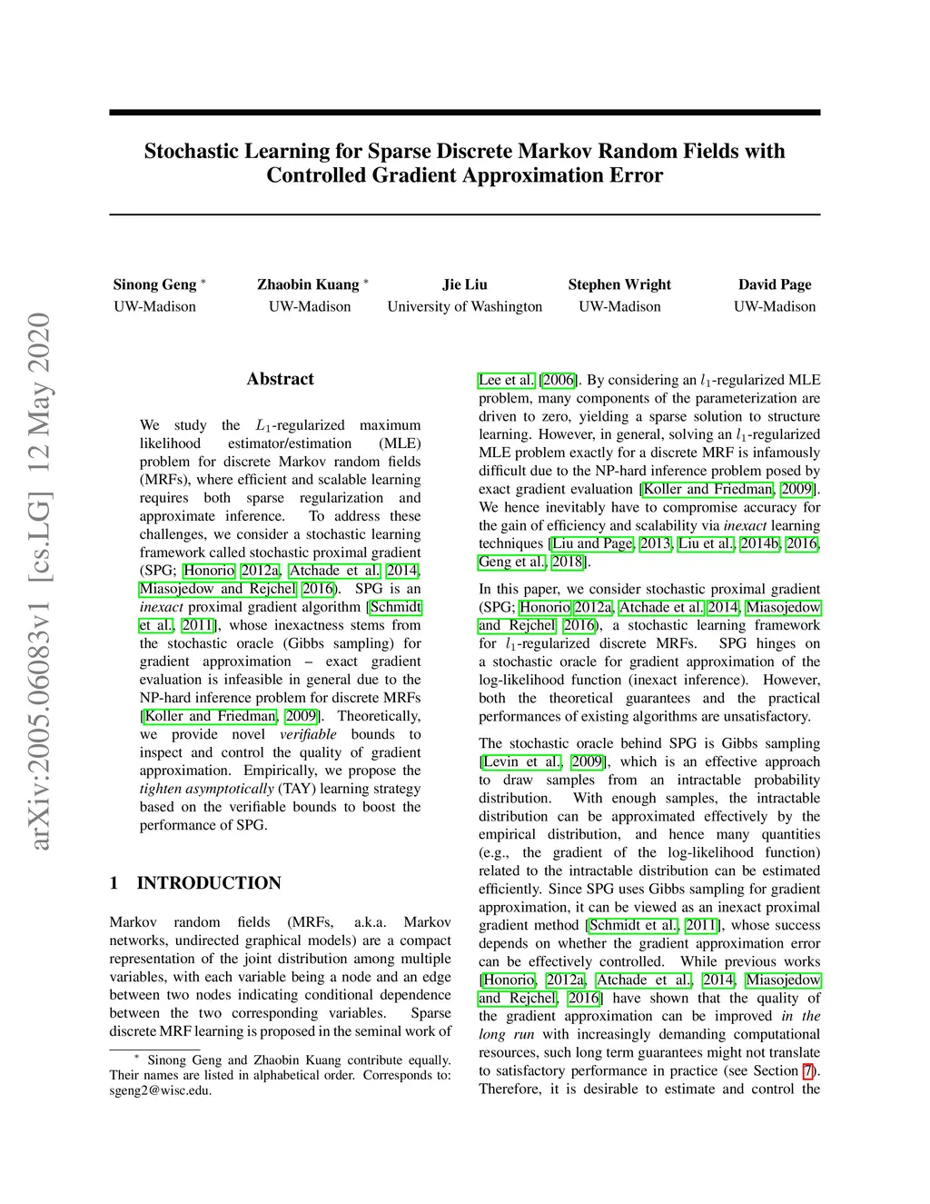 We study the -regularized maximum likelihood estimator/estimation (MLE) problem for discrete Markov random fields (MRFs), where efficient and scalable learning requires both sparse regularization and approximate inference. To address these challenges, we consider a stochastic learning framework called stochastic proximal gradient (SPG; Honorio 2012a, Atchade et al. 2014,Miasojedow and Rejchel 2016). SPG is an inexact proximal gradient algorithm [Schmidtet al., 2011], whose inexactness stems from the stochastic oracle (Gibbs sampling) for gradient approximation - exact gradient evaluation is infeasible in general due to the NP-hard inference problem for discrete MRFs [Koller and Friedman, 2009]. Theoretically, we provide novel verifiable bounds to inspect and control the quality of gradient approximation. Empirically, we propose the tighten asymptotically (TAY) learning strategy based on the verifiable bounds to boost the performance of SPG.
