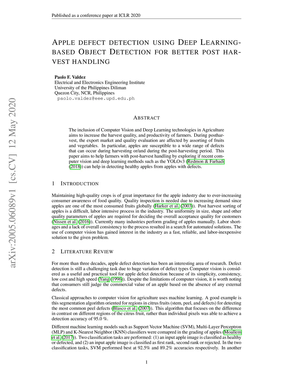 The inclusion of Computer Vision and Deep Learning technologies in Agriculture aims to increase the harvest quality, and productivity of farmers. During postharvest, the export market and quality evaluation are affected by assorting of fruits and vegetables. In particular, apples are susceptible to a wide range of defects that can occur during harvesting or/and during the post-harvesting period. This paper aims to help farmers with post-harvest handling by exploring if recent computer vision and deep learning methods such as the YOLOv3 (Redmon & Farhadi (2018)) can help in detecting healthy apples from apples with defects.