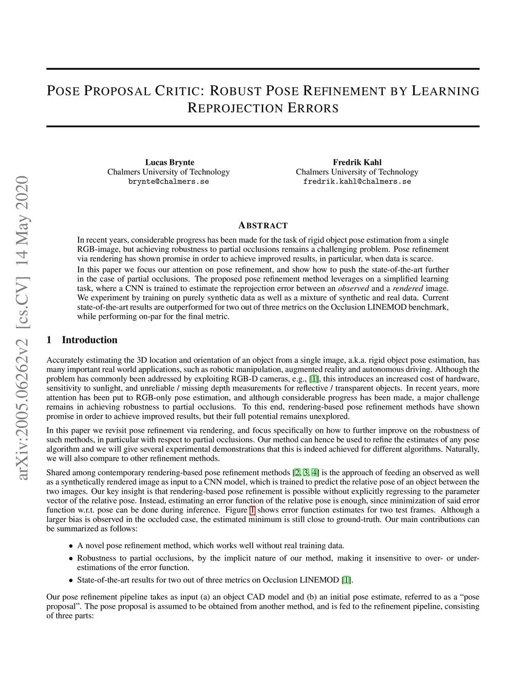 In recent years, considerable progress has been made for the task of rigid object pose estimation from a single RGB-image, but achieving robustness to partial occlusions remains a challenging problem. Pose refinement via rendering has shown promise in order to achieve improved results, in particular, when data is scarce. In this paper we focus our attention on pose refinement, and show how to push the state-of-the-art further in the case of partial occlusions. The proposed pose refinement method leverages on a simplified learning task, where a CNN is trained to estimate the reprojection error between an observed and a rendered image. We experiment by training on purely synthetic data as well as a mixture of synthetic and real data. Current state-of-the-art results are outperformed for two out of three metrics on the Occlusion LINEMOD benchmark, while performing on-par for the final metric.