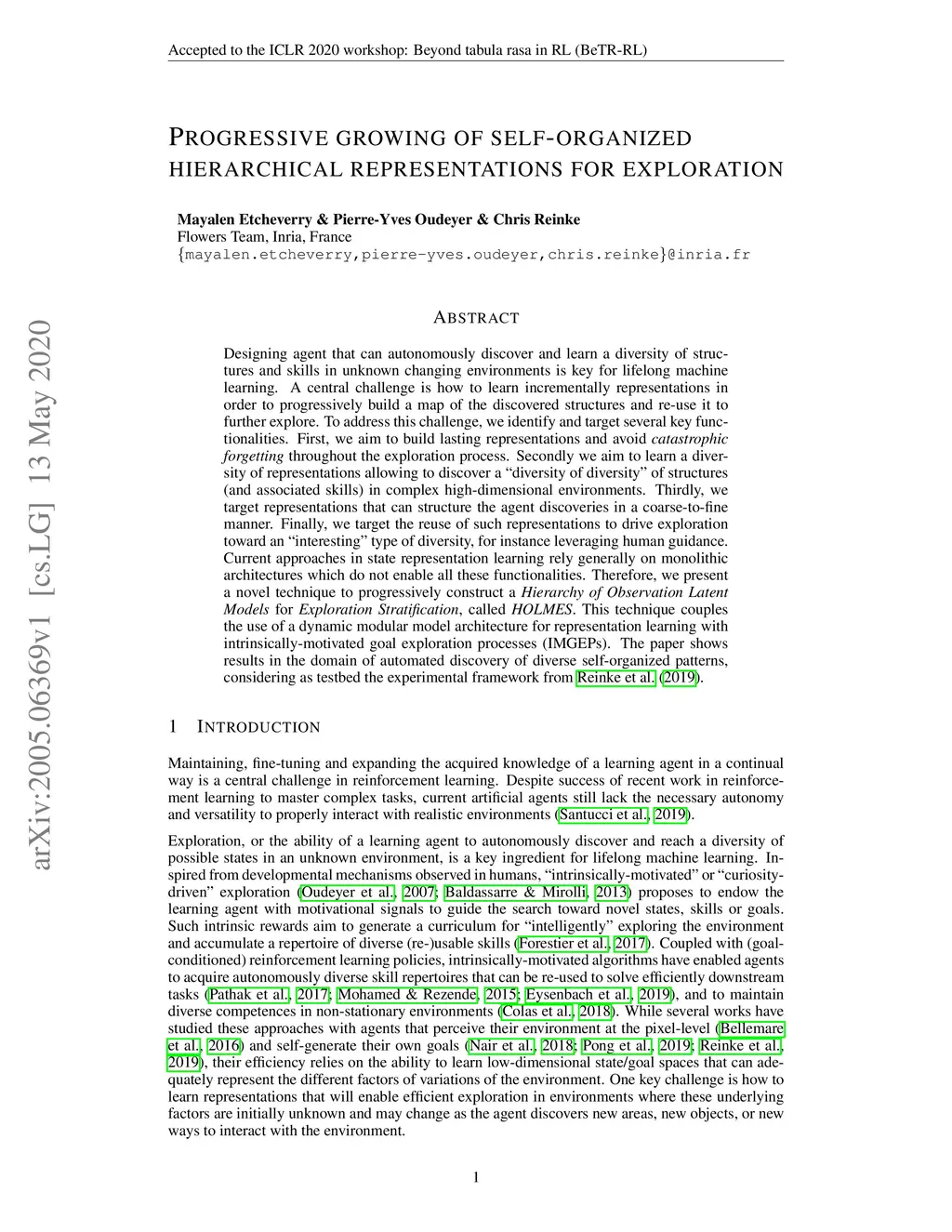 Designing agent that can autonomously discover and learn a diversity of structures and skills in unknown changing environments is key for lifelong machine learning. A central challenge is how to learn incrementally representations in order to progressively build a map of the discovered structures and re-use it to further explore. To address this challenge, we identify and target several key functionalities. First, we aim to build lasting representations and avoid catastrophic forgetting throughout the exploration process. Secondly we aim to learn a diversity of representations allowing to discover a "diversity of diversity" of structures (and associated skills) in complex high-dimensional environments. Thirdly, we target representations that can structure the agent discoveries in a coarse-to-fine manner. Finally, we target the reuse of such representations to drive exploration toward an "interesting" type of diversity, for instance leveraging human guidance. Current approaches in state representation learning rely generally on monolithic architectures which do not enable all these functionalities. Therefore, we present a novel technique to progressively construct a Hierarchy of Observation Latent Models for Exploration Stratification, called HOLMES. This technique couples the use of a dynamic modular model architecture for representation learning with intrinsically-motivated goal exploration processes (IMGEPs). The paper shows results in the domain of automated discovery of diverse self-organized patterns, considering as testbed the experimental framework from Reinke et al. (2019).