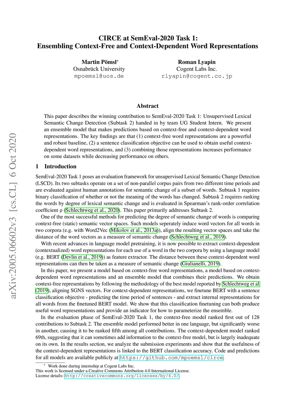 This paper describes the winning contribution to SemEval-2020 Task 1: Unsupervised Lexical Semantic Change Detection (Subtask 2) handed in by team UG Student Intern. We present an ensemble model that makes predictions based on context-free and context-dependent word representations. The key findings are that (1) context-free word representations are a powerful and robust baseline, (2) a sentence classification objective can be used to obtain useful context-dependent word representations, and (3) combining those representations increases performance on some datasets while decreasing performance on others.