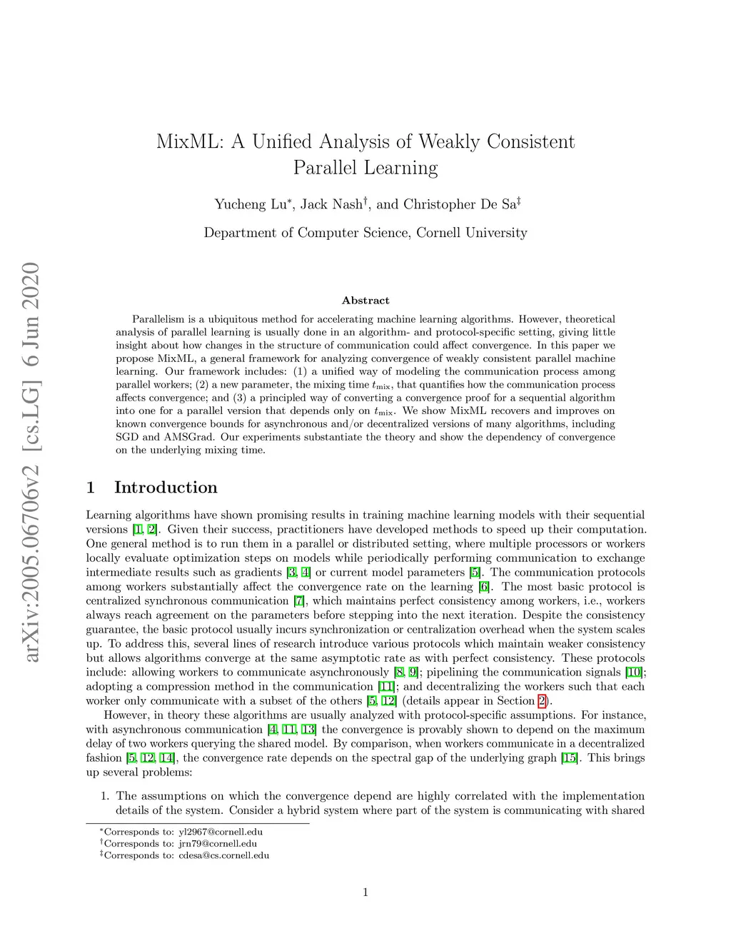 Parallelism is a ubiquitous method for accelerating machine learning algorithms. However, theoretical analysis of parallel learning is usually done in an algorithm- and protocol-specific setting, giving little insight about how changes in the structure of communication could affect convergence. In this paper we propose MixML, a general framework for analyzing convergence of weakly consistent parallel machine learning. Our framework includes: (1) a unified way of modeling the communication process among parallel workers; (2) a new parameter, the mixing time tmix, that quantifies how the communication process affects convergence; and (3) a principled way of converting a convergence proof for a sequential algorithm into one for a parallel version that depends only on tmix. We show MixML recovers and improves on known convergence bounds for asynchronous and/or decentralized versions of many algorithms, includingSGD and AMSGrad. Our experiments substantiate the theory and show the dependency of convergence on the underlying mixing time.