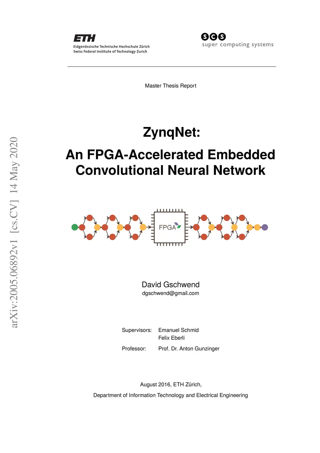 Image Understanding is becoming a vital feature in ever more applications ranging from medical diagnostics to autonomous vehicles. Many applications demand for embedded solutions that integrate into existing systems with tight real-time and power constraints. Convolutional Neural Networks (CNNs) presently achieve record-breaking accuracies in all image understanding benchmarks, but have a very high computational complexity. Embedded CNNs thus call for small and efficient, yet very powerful computing platforms. This master thesis explores the potential of FPGA-based CNN acceleration and demonstrates a fully functional proof-of-concept CNN implementation on a Zynq System-on-Chip. The ZynqNet Embedded CNN is designed for image classification on ImageNet and consists of ZynqNet CNN, an optimized and customized CNN topology, and the ZynqNet FPGA Accelerator, an FPGA-based architecture for its evaluation. ZynqNet CNN is a highly efficient CNN topology. Detailed analysis and optimization of prior topologies using the custom-designed Netscope CNN Analyzer have enabled a CNN with 84.5% top-5 accuracy at a computational complexity of only 530 million multiplyaccumulate operations. The topology is highly regular and consists exclusively of convolutional layers, ReLU nonlinearities and one global pooling layer. The CNN fits ideally onto the FPGA accelerator. The ZynqNet FPGA Accelerator allows an efficient evaluation of ZynqNet CNN. It accelerates the full network based on a nested-loop algorithm which minimizes the number of arithmetic operations and memory accesses. The FPGA accelerator has been synthesized using High-Level Synthesis for the Xilinx Zynq XC-7Z045, and reaches a clock frequency of 200MHz with a device utilization of 80% to 90 %.
