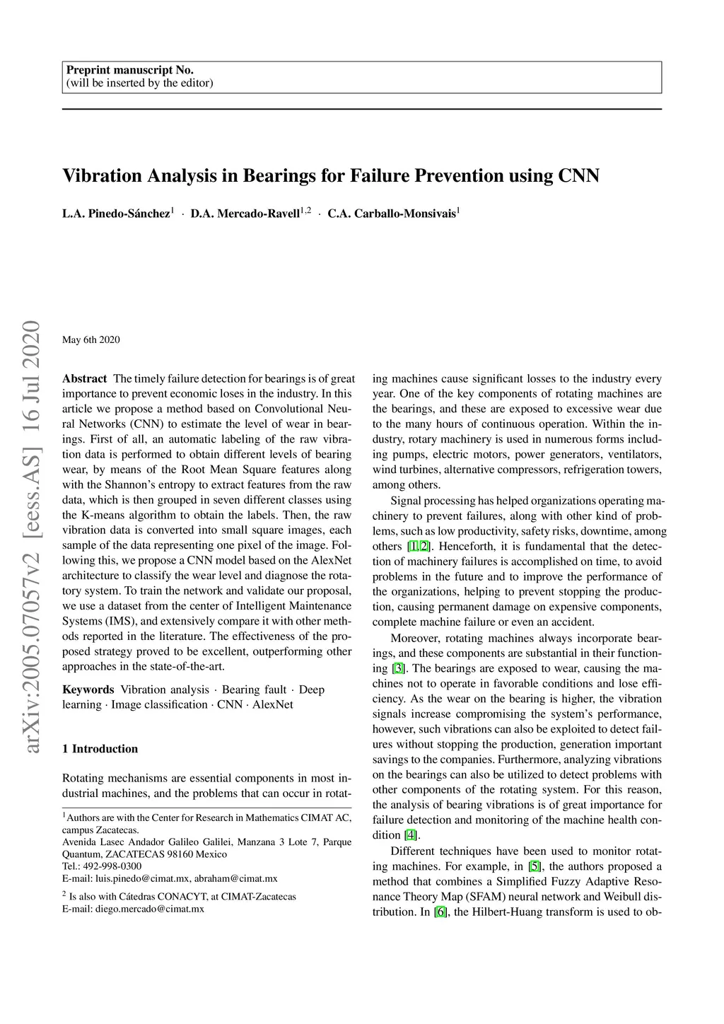 Vibration Analysis in Bearings for Failure Prevention using CNN