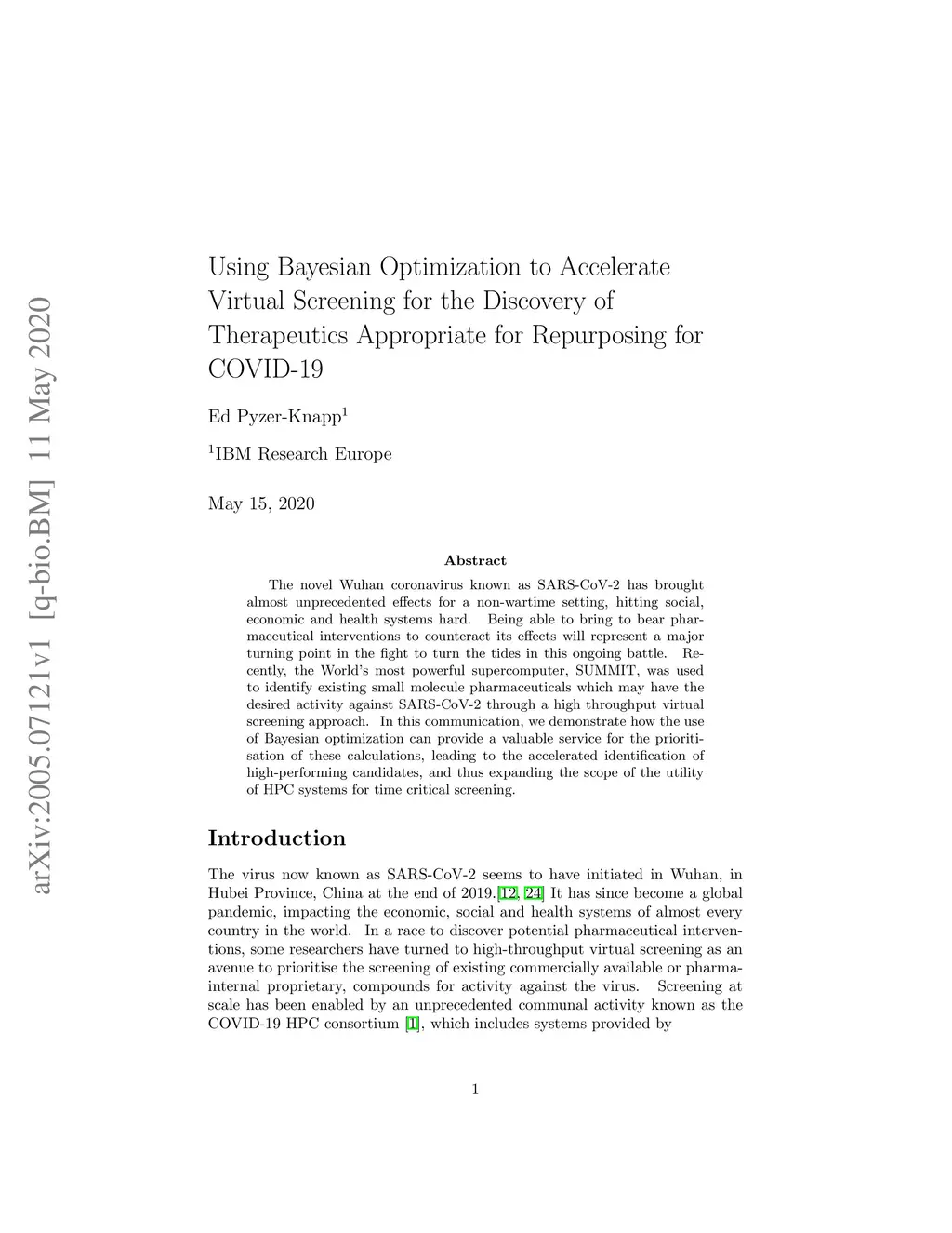 The novel Wuhan coronavirus known as SARS-CoV-2 has brought almost unprecedented effects for a non-wartime setting, hitting social, economic and health systems hard.~ Being able to bring to bear pharmaceutical interventions to counteract its effects will represent a major turning point in the fight to turn the tides in this ongoing battle.~ Recently, the World's most powerful supercomputer, SUMMIT, was used to identify existing small molecule pharmaceuticals which may have the desired activity against SARS-CoV-2 through a high throughput virtual screening approach. In this communication, we demonstrate how the use of Bayesian optimization can provide a valuable service for the prioritisation of these calculations, leading to the accelerated identification of high-performing candidates, and thus expanding the scope of the utility of HPC systems for time critical screening