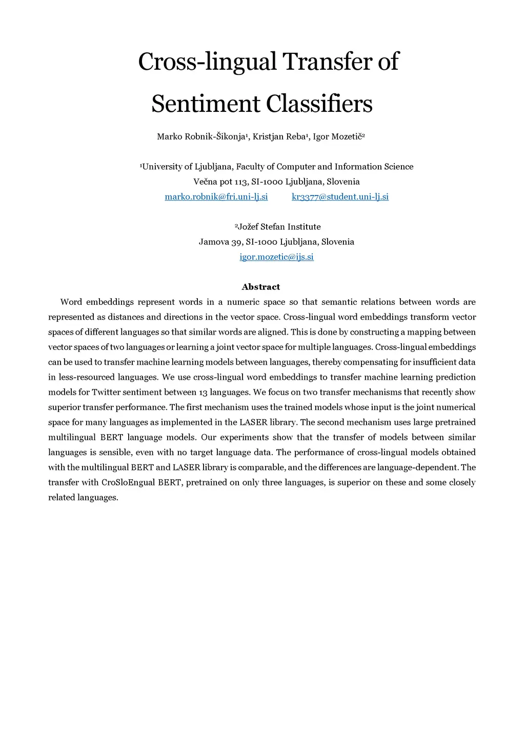 Cross-lingual Transfer of Sentiment Classifiers