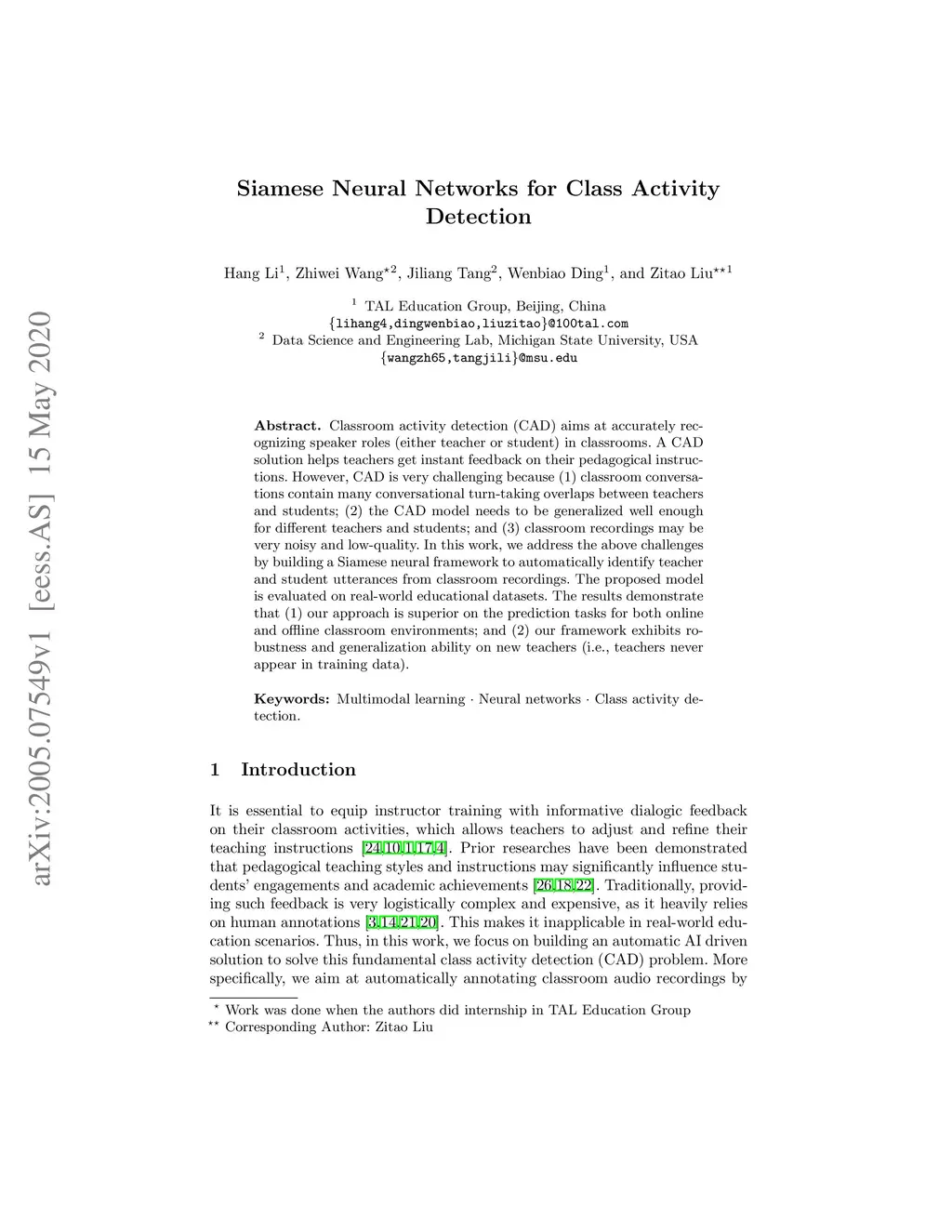 Classroom activity detection (CAD) aims at accurately recognizing speaker roles (either teacher or student) in classrooms. A CAD solution helps teachers get instant feedback on their pedagogical instructions. However, CAD is very challenging because (1) classroom conversations contain many conversational turn-taking overlaps between teachers and students; (2) the CAD model needs to be generalized well enough for different teachers and students; and (3) classroom recordings may be very noisy and low-quality. In this work, we address the above challenges by building a Siamese neural framework to automatically identify teacher and student utterances from classroom recordings. The proposed model is evaluated on real-world educational datasets. The results demonstrate that (1) our approach is superior on the prediction tasks for both online and offline classroom environments; and (2) our framework exhibits robustness and generalization ability on new teachers (i.e., teachers never appear in training data).