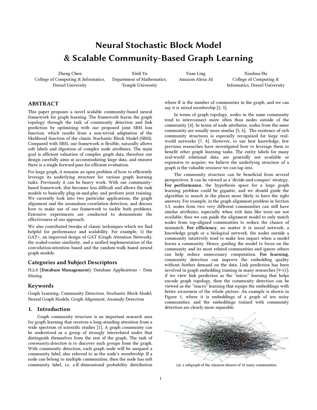 This paper proposes a novel scalable community-based neural framework for graph learning. The framework learns the graph topology through the task of community detection and link prediction by optimizing with our proposed joint SBM loss function, which results from a non-trivial adaptation of the likelihood function of the classic Stochastic Block Model (SBM). Compared with SBM, our framework is flexible, naturally allows soft labels and digestion of complex node attributes. The main goal is efficient valuation of complex graph data, therefore our design carefully aims at accommodating large data, and ensures there is a single forward pass for efficient evaluation. For large graph, it remains an open problem of how to efficiently leverage its underlying structure for various graph learning tasks. Previously it can be heavy work. With our community-based framework, this becomes less difficult and allows the task models to basically plug-in-and-play and perform joint training. We currently look into two particular applications, the graph alignment and the anomalous correlation detection, and discuss how to make use of our framework to tackle both problems. Extensive experiments are conducted to demonstrate the effectiveness of our approach. We also contributed tweaks of classic techniques which we find helpful for performance and scalability. For example, 1) the GAT+, an improved design of GAT (Graph Attention Network), the scaled-cosine similarity, and a unified implementation of the convolution/attention based and the random-walk based neural graph models.