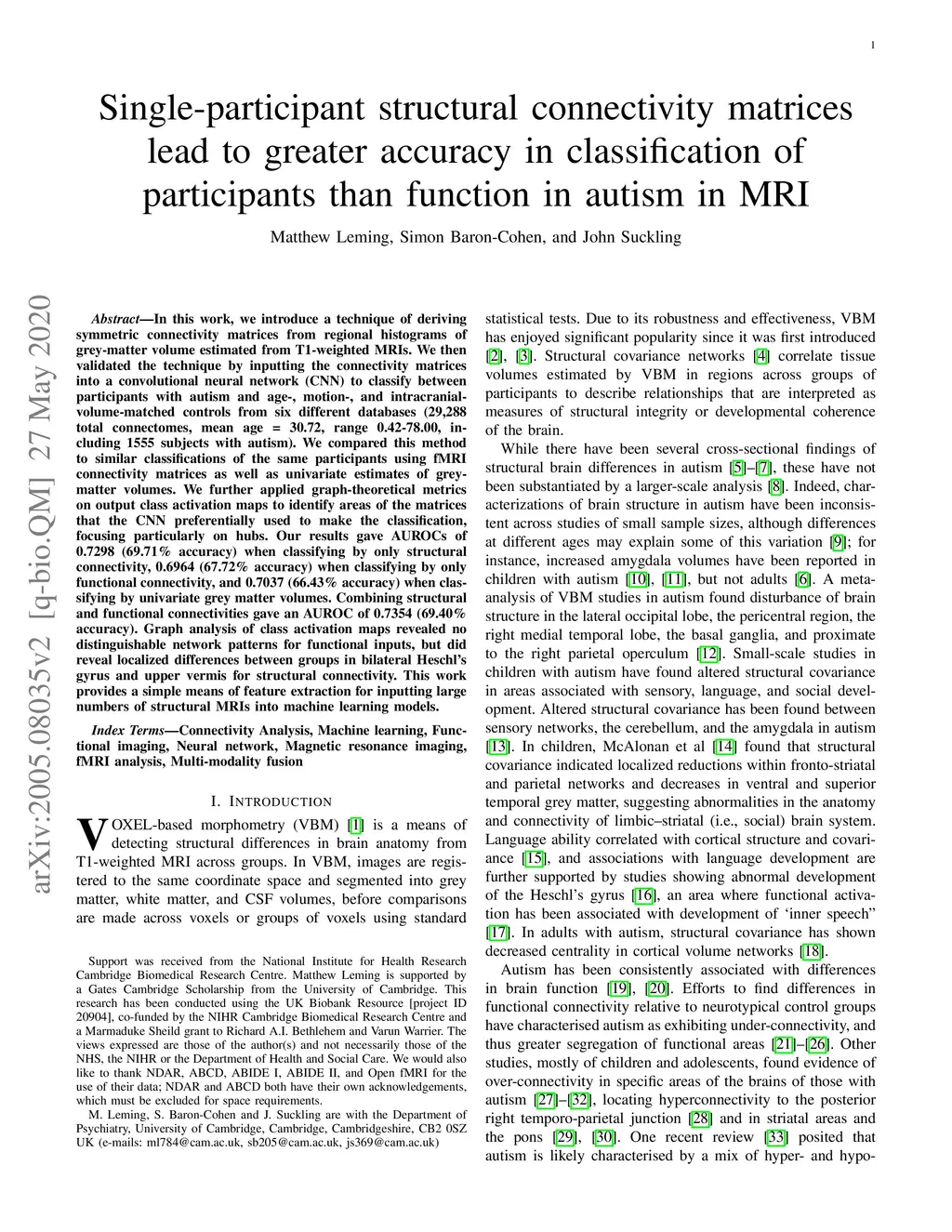 In this work, we introduce a technique of deriving symmetric connectivity matrices from regional histograms of grey-matter volume estimated from T1-weighted MRIs. We then validated the technique by inputting the connectivity matrices into a convolutional neural network (CNN) to classify between participants with autism and age-, motion-, and intracranial-volume-matched controls from six different databases (29,288 total connectomes, mean age = 30.72, range 0.42-78.00, including 1555 subjects with autism). We compared this method to similar classifications of the same participants using fMRI connectivity matrices as well as univariate estimates of grey-matter volumes. We further applied graph-theoretical metrics on output class activation maps to identify areas of the matrices that the CNN preferentially used to make the classification, focusing particularly on hubs. Our results gave AUROCs of 0.7298 (69.71% accuracy) when classifying by only structural connectivity, 0.6964 (67.72% accuracy) when classifying by only functional connectivity, and 0.7037 (66.43% accuracy) when classifying by univariate grey matter volumes. Combining structural and functional connectivities gave an AUROC of 0.7354 (69.40% accuracy). Graph analysis of class activation maps revealed no distinguishable network patterns for functional inputs, but did reveal localized differences between groups in bilateral Heschl's gyrus and upper vermis for structural connectivity. This work provides a simple means of feature extraction for inputting large numbers of structural MRIs into machine learning models.
