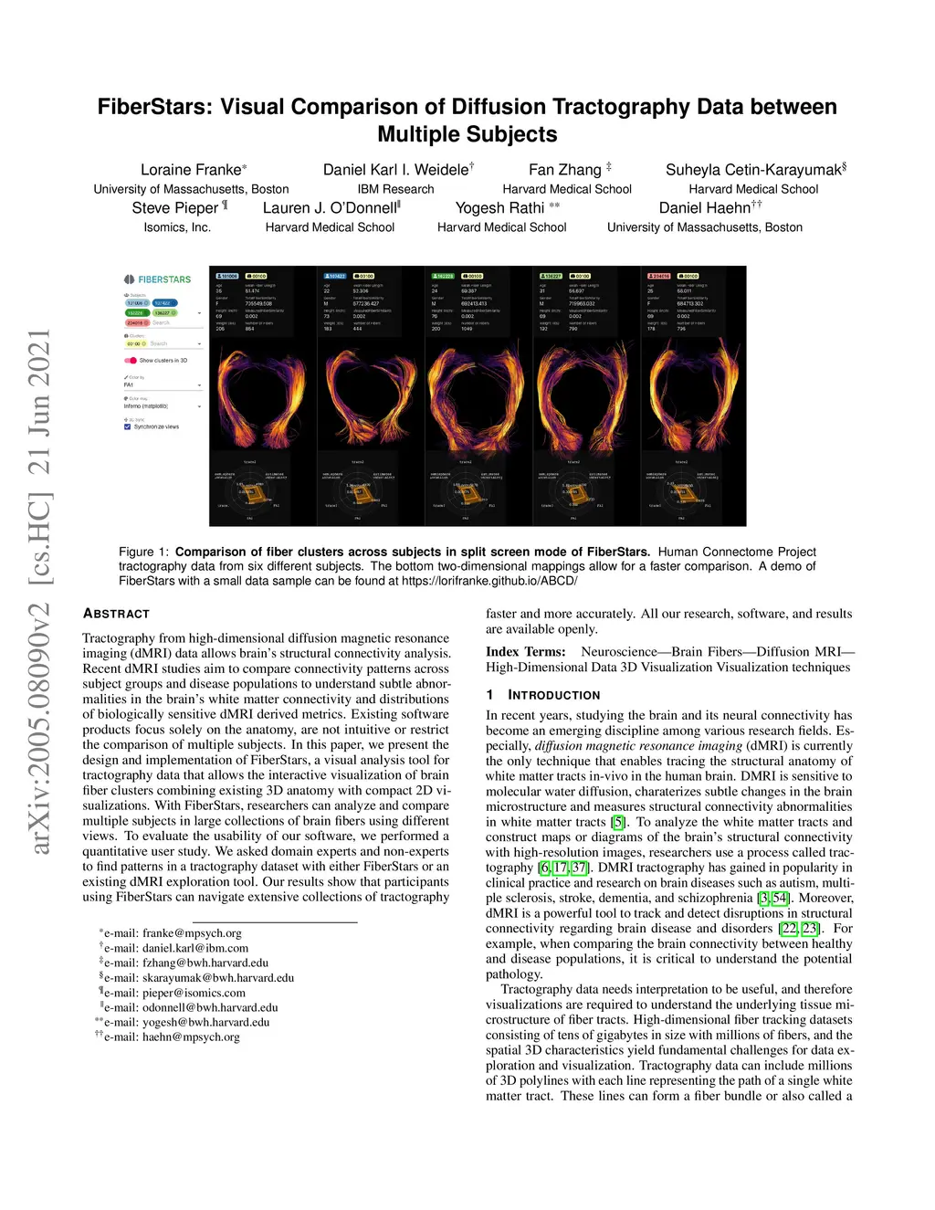 Tractography from high-dimensional diffusion magnetic resonance imaging (dMRI) data allows brain's structural connectivity analysis. Recent dMRI studies aim to compare connectivity patterns across subject groups and disease populations to understand subtle abnormalities in the brain's white matter connectivity and distributions of biologically sensitive dMRI derived metrics. Existing software products focus solely on the anatomy, are not intuitive or restrict the comparison of multiple subjects. In this paper, we present the design and implementation of FiberStars, a visual analysis tool for tractography data that allows the interactive visualization of brain fiber clusters combining existing 3D anatomy with compact 2D visualizations. With FiberStars, researchers can analyze and compare multiple subjects in large collections of brain fibers using different views. To evaluate the usability of our software, we performed a quantitative user study. We asked domain experts and non-experts to find patterns in a tractography dataset with either FiberStars or an existing dMRI exploration tool. Our results show that participants using FiberStars can navigate extensive collections of tractography faster and more accurately. All our research, software, and results are available openly.