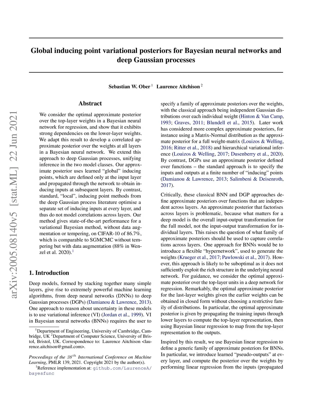 We consider the optimal approximate posterior over the top-layer weights in a Bayesian neural network for regression, and show that it exhibits strong dependencies on the lower-layer weights. We adapt this result to develop a correlated approximate posterior over the weights at all layers in a Bayesian neural network. We extend this approach to deep Gaussian processes, unifying inference in the two model classes. Our approximate posterior uses learned "global" inducing points, which are defined only at the input layer and propagated through the network to obtain inducing inputs at subsequent layers. By contrast, standard, "local", inducing point methods from the deep Gaussian process literature optimise a separate set of inducing inputs at every layer, and thus do not model correlations across layers. Our method gives state-of-the-art performance for a variational Bayesian method, without data augmentation or tempering, on CIFAR-10 of 86.7%, which is comparable to SGMCMC without tempering but with data augmentation (88% in Wenzel et al. 2020).