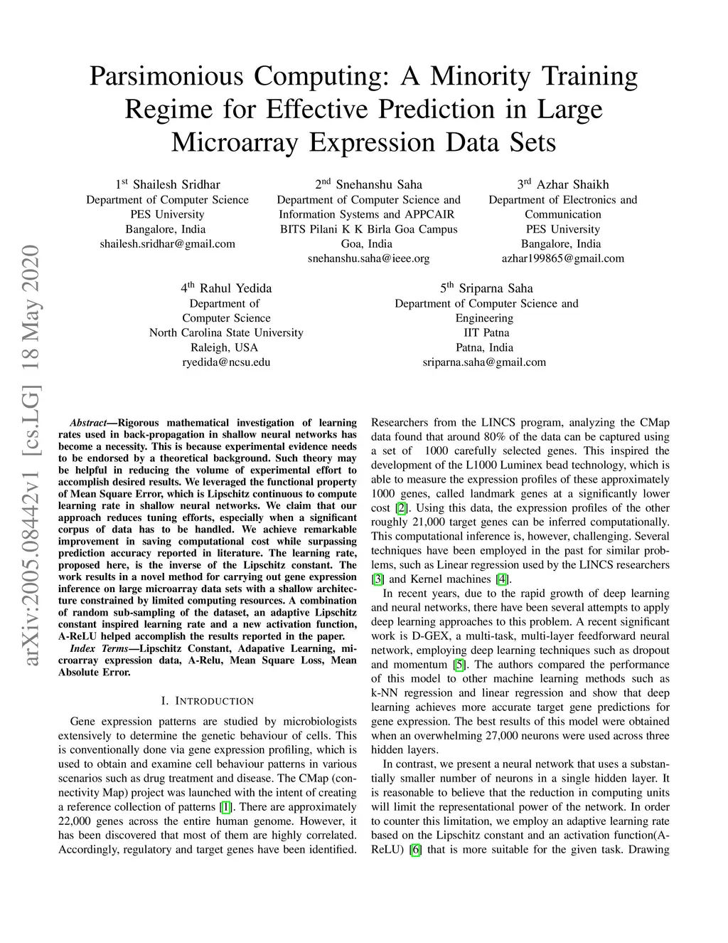 Rigorous mathematical investigation of learning rates used in back-propagation in shallow neural networks has become a necessity. This is because experimental evidence needs to be endorsed by a theoretical background. Such theory may be helpful in reducing the volume of experimental effort to accomplish desired results. We leveraged the functional property of Mean Square Error, which is Lipschitz continuous to compute learning rate in shallow neural networks. We claim that our approach reduces tuning efforts, especially when a significant corpus of data has to be handled. We achieve remarkable improvement in saving computational cost while surpassing prediction accuracy reported in literature. The learning rate, proposed here, is the inverse of the Lipschitz constant. The work results in a novel method for carrying out gene expression inference on large microarray data sets with a shallow architecture constrained by limited computing resources. A combination of random sub-sampling of the dataset, an adaptive Lipschitz constant inspired learning rate and a new activation function, A-ReLU helped accomplish the results reported in the paper.