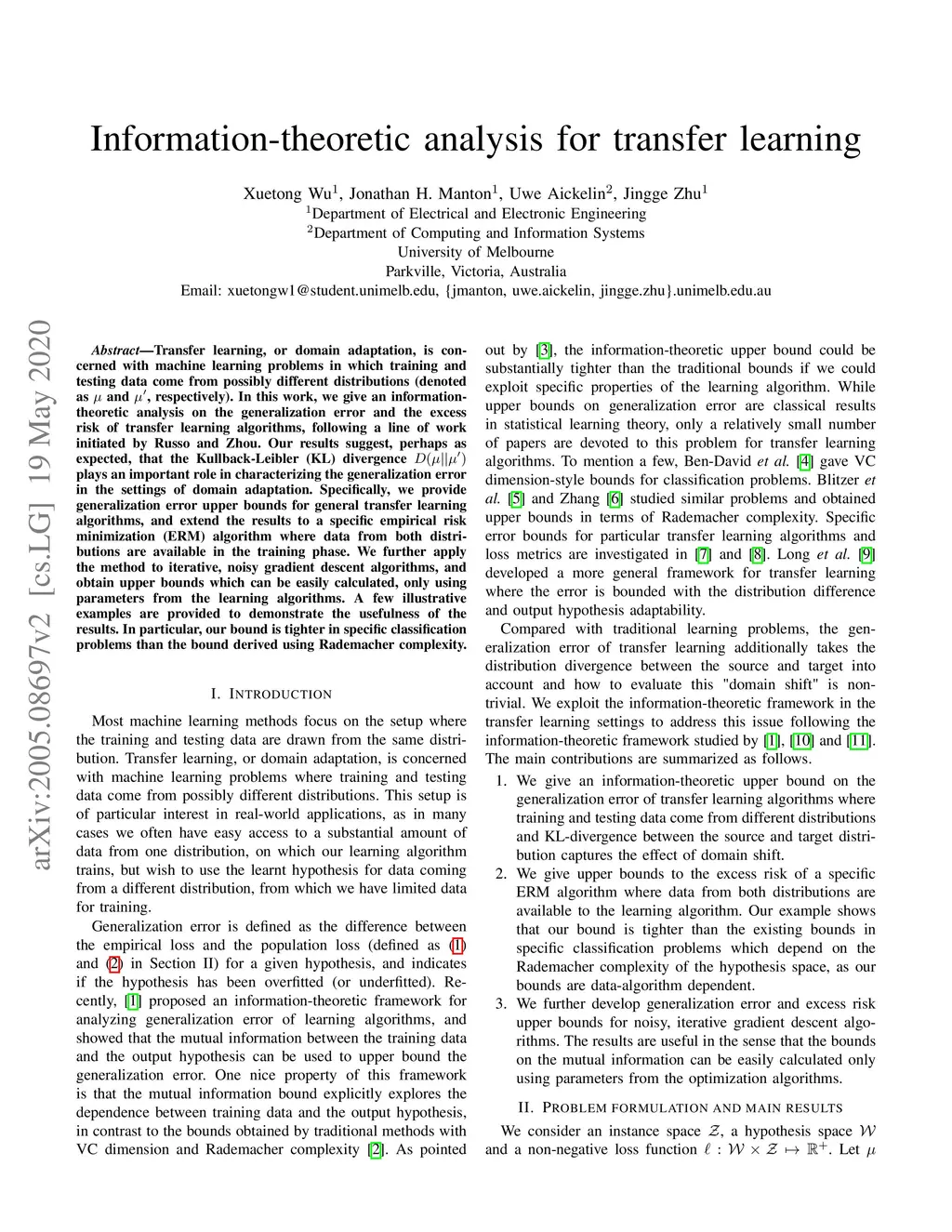 Transfer learning, or domain adaptation, is concerned with machine learning problems in which training and testing data come from possibly different distributions (denoted as and , respectively). In this work, we give an information-theoretic analysis on the generalization error and the excess risk of transfer learning algorithms, following a line of work initiated by Russo and Zhou. Our results suggest, perhaps as expected, that the Kullback-Leibler (KL) divergence plays an important role in characterizing the generalization error in the settings of domain adaptation. Specifically, we provide generalization error upper bounds for general transfer learning algorithms and extend the results to a specific empirical risk minimization (ERM) algorithm where data from both distributions are available in the training phase. We further apply the method to iterative, noisy gradient descent algorithms, and obtain upper bounds which can be easily calculated, only using parameters from the learning algorithms. A few illustrative examples are provided to demonstrate the usefulness of the results. In particular, our bound is tighter in specific classification problems than the bound derived using Rademacher complexity.