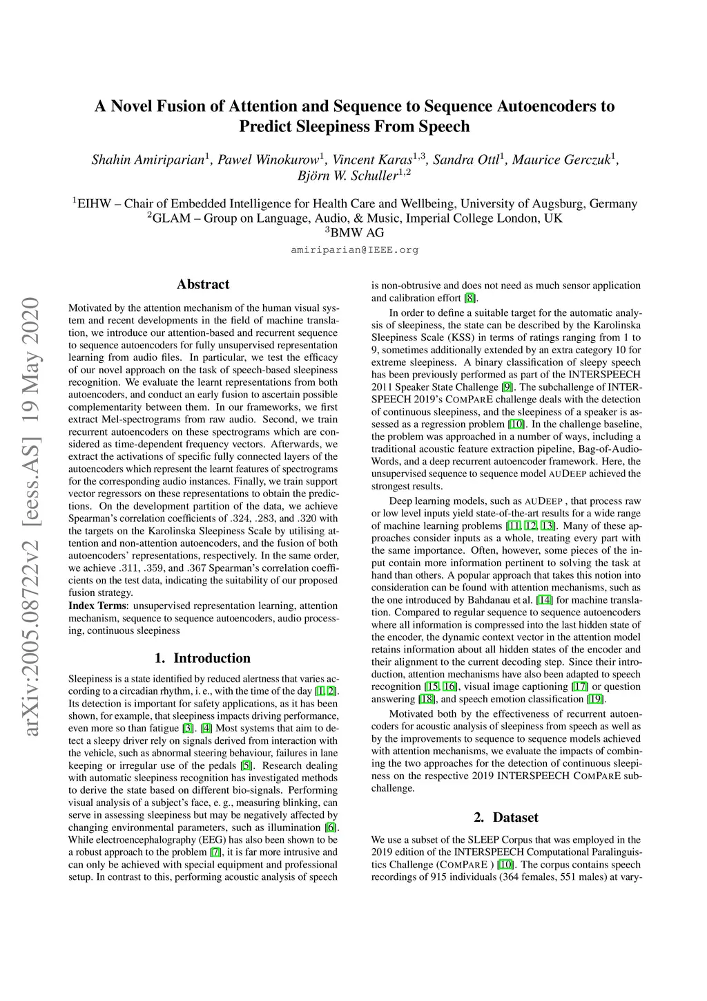 Motivated by the attention mechanism of the human visual system and recent developments in the field of machine translation, we introduce our attention-based and recurrent sequence to sequence autoencoders for fully unsupervised representation learning from audio files. In particular, we test the efficacy of our novel approach on the task of speech-based sleepiness recognition. We evaluate the learnt representations from both autoencoders, and then conduct an early fusion to ascertain possible complementarity between them. In our frameworks, we first extract Mel-spectrograms from raw audio files. Second, we train recurrent autoencoders on these spectrograms which are considered as time-dependent frequency vectors. Afterwards, we extract the activations of specific fully connected layers of the autoencoders which represent the learnt features of spectrograms for the corresponding audio instances. Finally, we train support vector regressors on these representations to obtain the predictions. On the development partition of the data, we achieve Spearman's correlation coefficients of .324, .283, and .320 with the targets on the Karolinska Sleepiness Scale by utilising attention and non-attention autoencoders, and the fusion of both autoencoders' representations, respectively. In the same order, we achieve .311, .359, and .367 Spearman's correlation coefficients on the test data, indicating the suitability of our proposed fusion strategy.