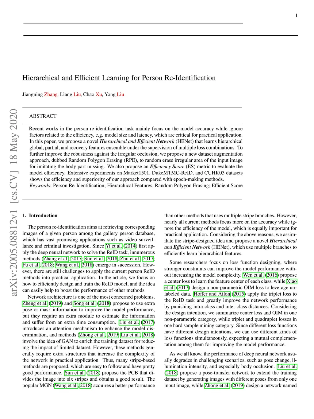 Recent works in the person re-identification task mainly focus on the model accuracy while ignore factors related to the efficiency, e.g. model size and latency, which are critical for practical application. In this paper, we propose a novel Hierarchical and Efficient Network (HENet) that learns hierarchical global, partial, and recovery features ensemble under the supervision of multiple loss combinations. To further improve the robustness against the irregular occlusion, we propose a new dataset augmentation approach, dubbed Random Polygon Erasing (RPE), to random erase irregular area of the input image for imitating the body part missing. We also propose an Efficiency Score (ES) metric to evaluate the model efficiency. Extensive experiments on Market1501, DukeMTMC-ReID, and CUHK03 datasets shows the efficiency and superiority of our approach compared with epoch-making methods.