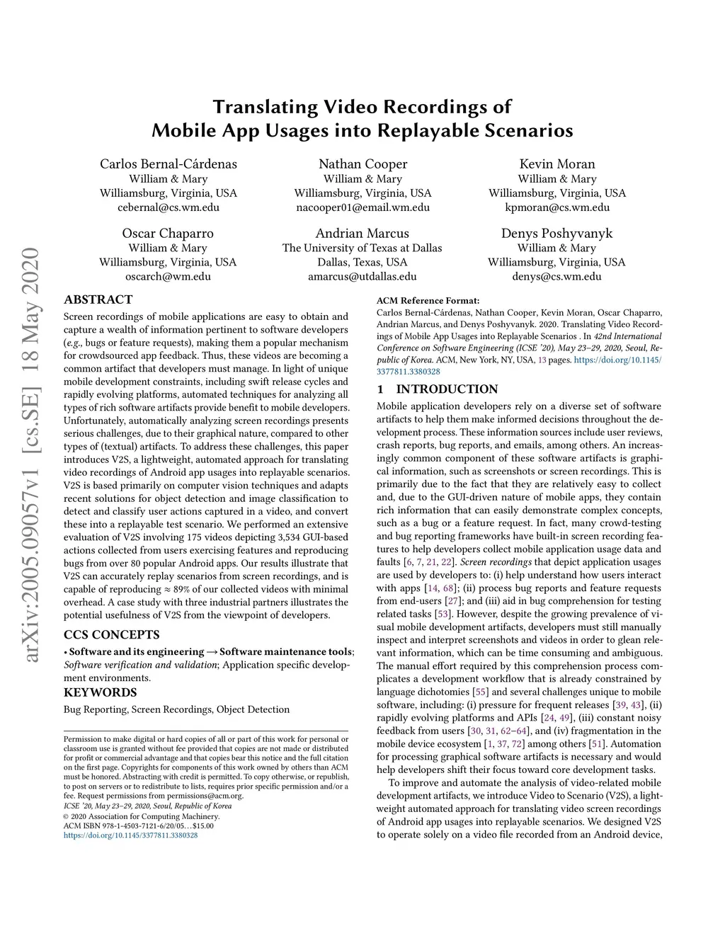Screen recordings of mobile applications are easy to obtain and capture a wealth of information pertinent to software developers (e.g., bugs or feature requests), making them a popular mechanism for crowdsourced app feedback. Thus, these videos are becoming a common artifact that developers must manage. In light of unique mobile development constraints, including swift release cycles and rapidly evolving platforms, automated techniques for analyzing all types of rich software artifacts provide benefit to mobile developers. Unfortunately, automatically analyzing screen recordings presents serious challenges, due to their graphical nature, compared to other types of (textual) artifacts. To address these challenges, this paper introduces V2S, a lightweight, automated approach for translating video recordings of Android app usages into replayable scenarios. V2S is based primarily on computer vision techniques and adapts recent solutions for object detection and image classification to detect and classify user actions captured in a video, and convert these into a replayable test scenario. We performed an extensive evaluation of V2S involving 175 videos depicting 3,534 GUI-based actions collected from users exercising features and reproducing bugs from over 80 popular Android apps. Our results illustrate that V2S can accurately replay scenarios from screen recordings, and is capable of reproducing 89% of our collected videos with minimal overhead. A case study with three industrial partners illustrates the potential usefulness of V2S from the viewpoint of developers.
