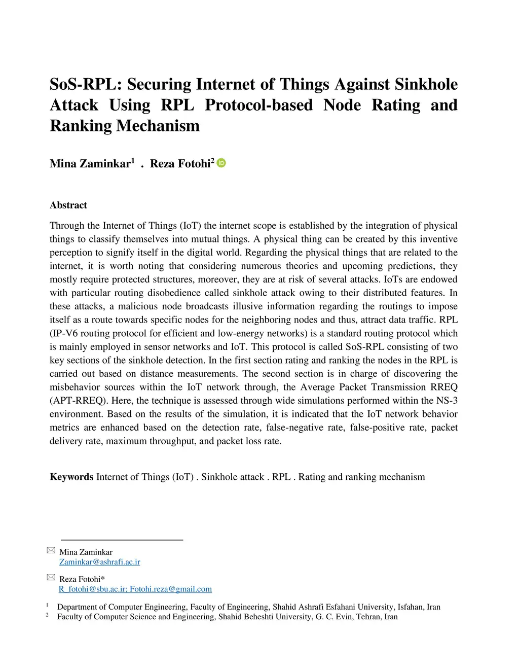 SoS-RPL: Securing Internet of Things Against Sinkhole Attack Using RPL