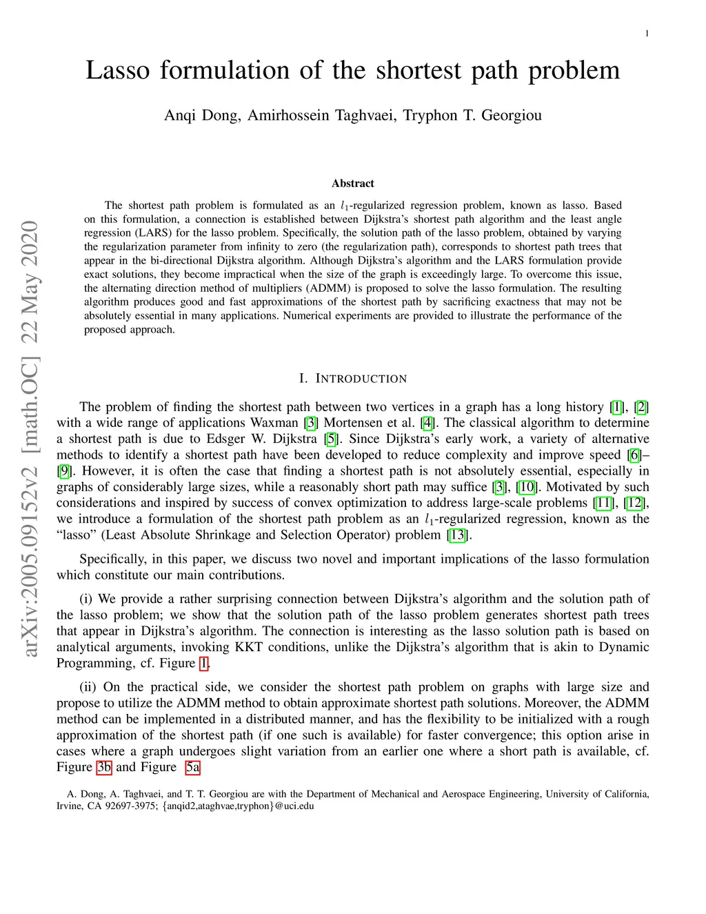 The shortest path problem is formulated as an -regularized regression problem, known as lasso. Based on this formulation, a connection is established between Dijkstra's shortest path algorithm and the least angle regression (LARS) for the lasso problem. Specifically, the solution path of the lasso problem, obtained by varying the regularization parameter from infinity to zero (the regularization path), corresponds to shortest path trees that appear in the bi-directional Dijkstra algorithm. Although Dijkstra's algorithm and the LARS formulation provide exact solutions, they become impractical when the size of the graph is exceedingly large. To overcome this issue, the alternating direction method of multipliers (ADMM) is proposed to solve the lasso formulation. The resulting algorithm produces good and fast approximations of the shortest path by sacrificing exactness that may not be absolutely essential in many applications. Numerical experiments are provided to illustrate the performance of the proposed approach.