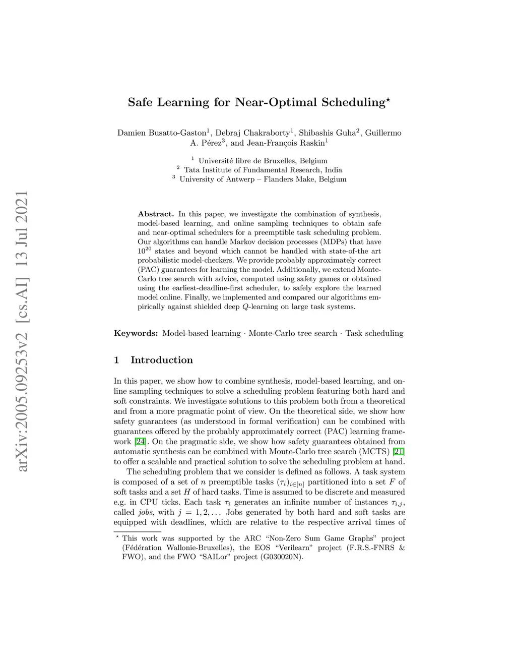 In this paper, we investigate the combination of synthesis, model-based learning, and online sampling techniques to obtain safe and near-optimal schedulers for a preemptible task scheduling problem. Our algorithms can handle Markov decision processes (MDPs) that have 1020 states and beyond which cannot be handled with state-of-the art probabilistic model-checkers. We provide probably approximately correct (PAC) guarantees for learning the model. Additionally, we extend Monte-Carlo tree search with advice, computed using safety games or obtained using the earliest-deadline-first scheduler, to safely explore the learned model online. Finally, we implemented and compared our algorithms empirically against shielded deep Q-learning on large task systems.
