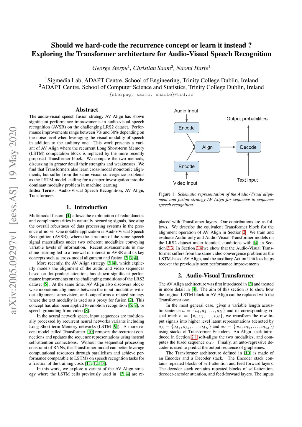 The audio-visual speech fusion strategy AV Align has shown significant performance improvements in audio-visual speech recognition (AVSR) on the challenging LRS2 dataset. Performance improvements range between 7% and 30% depending on the noise level when leveraging the visual modality of speech in addition to the auditory one. This work presents a variant of AV Align where the recurrent Long Short-term Memory (LSTM) computation block is replaced by the more recently proposed Transformer block. We compare the two methods, discussing in greater detail their strengths and weaknesses. We find that Transformers also learn cross-modal monotonic alignments, but suffer from the same visual convergence problems as the LSTM model, calling for a deeper investigation into the dominant modality problem in machine learning.
