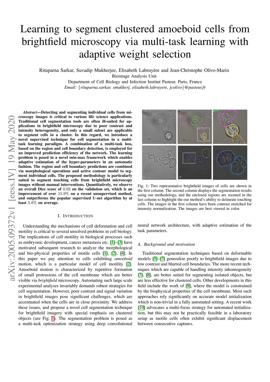 Detecting and segmenting individual cells from microscopy images is critical to various life science applications. Traditional cell segmentation tools are often ill-suited for applications in brightfield microscopy due to poor contrast and intensity heterogeneity, and only a small subset are applicable to segment cells in a cluster. In this regard, we introduce a novel supervised technique for cell segmentation in a multi-task learning paradigm. A combination of a multi-task loss, based on the region and cell boundary detection, is employed for an improved prediction efficiency of the network. The learning problem is posed in a novel min-max framework which enables adaptive estimation of the hyper-parameters in an automatic fashion. The region and cell boundary predictions are combined via morphological operations and active contour model to segment individual cells. The proposed methodology is particularly suited to segment touching cells from brightfield microscopy images without manual interventions. Quantitatively, we observe an overall Dice score of 0.93 on the validation set, which is an improvement of over 15.9% on a recent unsupervised method, and outperforms the popular supervised U-net algorithm by at least on average.