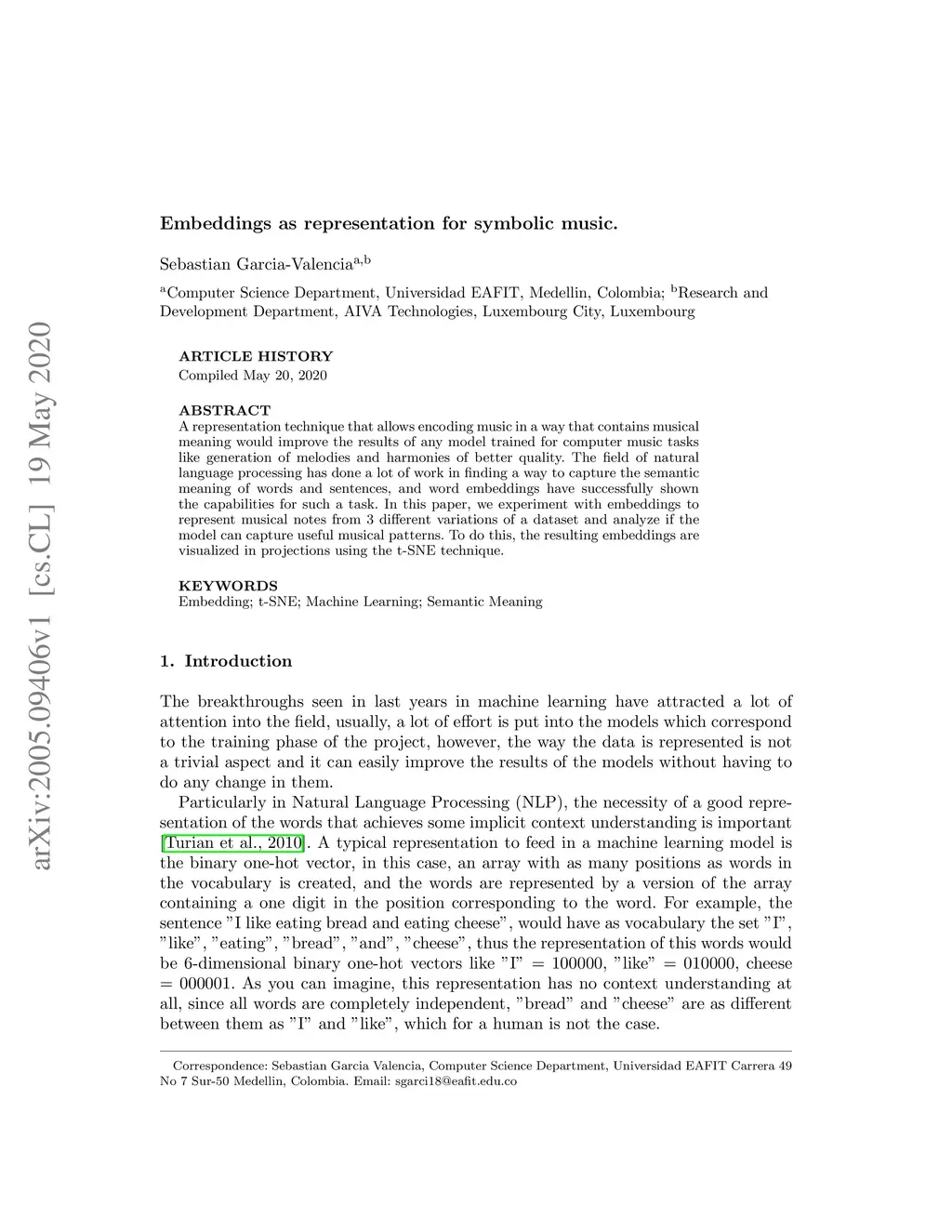 A representation technique that allows encoding music in a way that contains musical meaning would improve the results of any model trained for computer music tasks like generation of melodies and harmonies of better quality. The field of natural language processing has done a lot of work in finding a way to capture the semantic meaning of words and sentences, and word embeddings have successfully shown the capabilities for such a task. In this paper, we experiment with embeddings to represent musical notes from 3 different variations of a dataset and analyze if the model can capture useful musical patterns. To do this, the resulting embeddings are visualized in projections using the t-SNE technique.