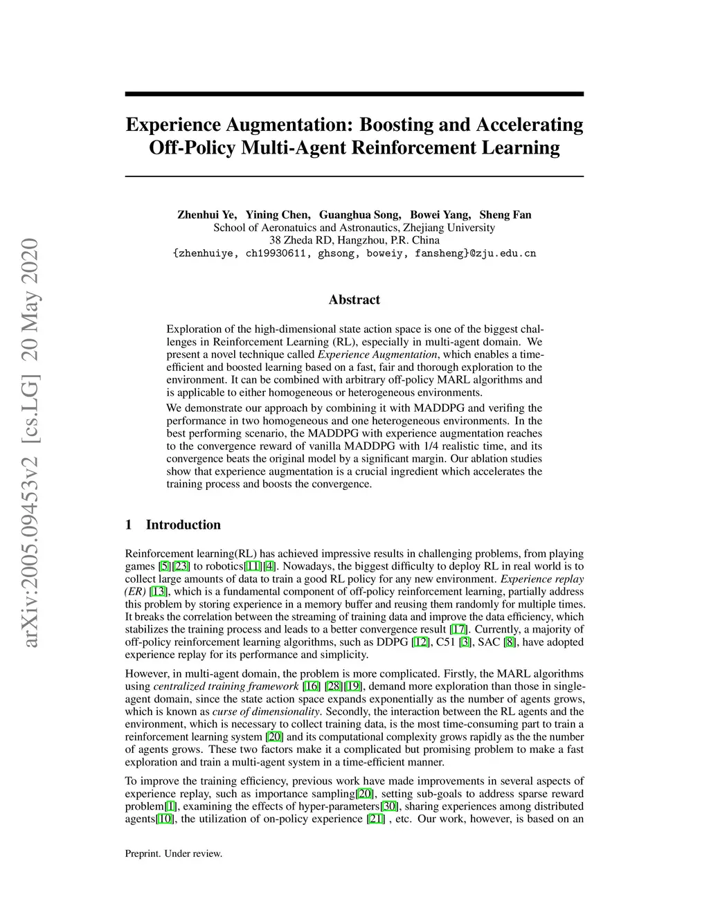 Exploration of the high-dimensional state action space is one of the biggest challenges in Reinforcement Learning (RL), especially in multi-agent domain. We present a novel technique called Experience Augmentation, which enables a time-efficient and boosted learning based on a fast, fair and thorough exploration to the environment. It can be combined with arbitrary off-policy MARL algorithms and is applicable to either homogeneous or heterogeneous environments. We demonstrate our approach by combining it with MADDPG and verifing the performance in two homogeneous and one heterogeneous environments. In the best performing scenario, the MADDPG with experience augmentation reaches to the convergence reward of vanilla MADDPG with 1/4 realistic time, and its convergence beats the original model by a significant margin. Our ablation studies show that experience augmentation is a crucial ingredient which accelerates the training process and boosts the convergence.