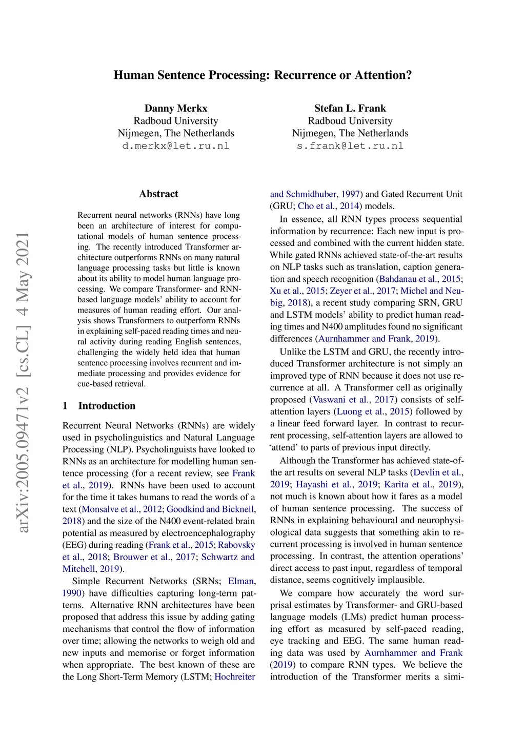 Human Sentence Processing: Recurrence or Attention?