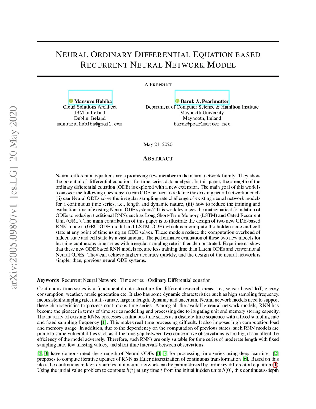 Neural differential equations are a promising new member in the neural network family. They show the potential of differential equations for time series data analysis. In this paper, the strength of the ordinary differential equation (ODE) is explored with a new extension. The main goal of this work is to answer the following questions: (i)~can ODE be used to redefine the existing neural network model? (ii)~can Neural ODEs solve the irregular sampling rate challenge of existing neural network models for a continuous time series, i.e., length and dynamic nature, (iii)~how to reduce the training and evaluation time of existing Neural ODE systems? This work leverages the mathematical foundation of ODEs to redesign traditional RNNs such as Long Short-Term Memory (LSTM) and Gated Recurrent Unit (GRU). The main contribution of this paper is to illustrate the design of two new ODE-based RNN models (GRU-ODE model and LSTM-ODE) which can compute the hidden state and cell state at any point of time using an ODE solver. These models reduce the computation overhead of hidden state and cell state by a vast amount. The performance evaluation of these two new models for learning continuous time series with irregular sampling rate is then demonstrated. Experiments show that these new ODE based RNN models require less training time than Latent ODEs and conventional Neural ODEs. They can achieve higher accuracy quickly, and the design of the neural network is simpler than, previous neural ODE systems.