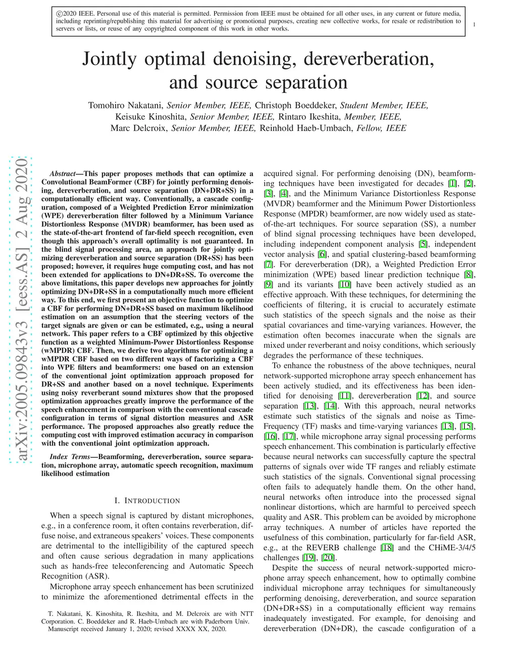 This paper proposes methods that can optimize a Convolutional BeamFormer (CBF) for jointly performing denoising, dereverberation, and source separation (DN+DR+SS) in a computationally efficient way. Conventionally, cascade configuration composed of a Weighted Prediction Error minimization (WPE) dereverberation filter followed by a Minimum Variance Distortionless Response beamformer has been usedas the state-of-the-art frontend of far-field speech recognition, however, overall optimality of this approach is not guaranteed. In the blind signal processing area, an approach for jointly optimizing dereverberation and source separation (DR+SS) has been proposed, however, this approach requires huge computing cost, and has not been extended for application to DN+DR+SS. To overcome the above limitations, this paper develops new approaches for jointly optimizing DN+DR+SS in a computationally much more efficient way. To this end, we first present an objective function to optimize a CBF for performing DN+DR+SS based on the maximum likelihood estimation, on an assumption that the steering vectors of the target signals are given or can be estimated, e.g., using a neural network. This paper refers to a CBF optimized by this objective function as a weighted Minimum-Power Distortionless Response (wMPDR) CBF. Then, we derive two algorithms for optimizing a wMPDR CBF based on two different ways of factorizing a CBF into WPE filters and beamformers. Experiments using noisy reverberant sound mixtures show that the proposed optimization approaches greatly improve the performance of the speech enhancement in comparison with the conventional cascade configuration in terms of the signal distortion measures and ASR performance. It is also shown that the proposed approaches can greatly reduce the computing cost with improved estimation accuracy in comparison with the conventional joint optimization approach.
