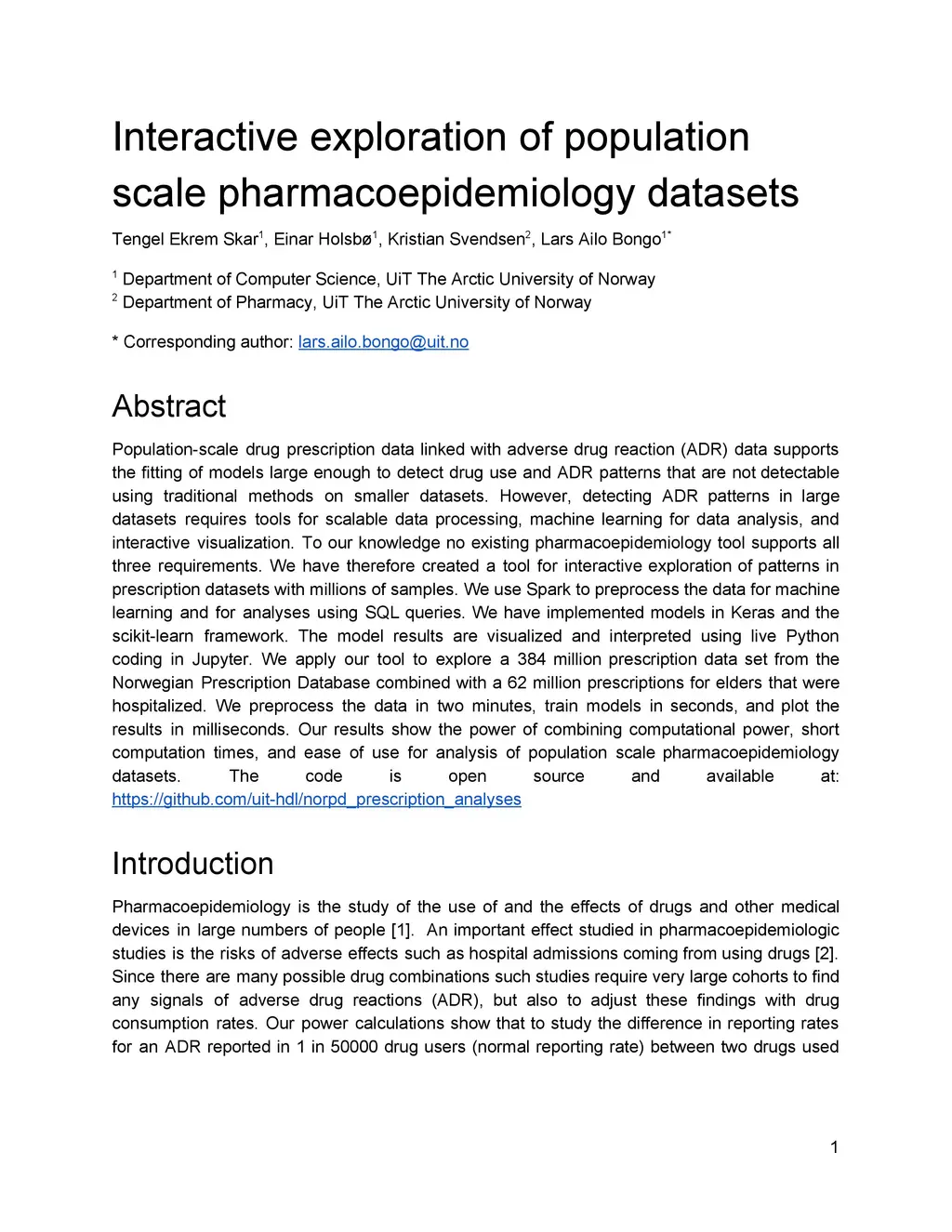 Population-scale drug prescription data linked with adverse drug reaction (ADR) data supports the fitting of models large enough to detect drug use and ADR patterns that are not detectable using traditional methods on smaller datasets. However, detecting ADR patterns in large datasets requires tools for scalable data processing, machine learning for data analysis, and interactive visualization. To our knowledge no existing pharmacoepidemiology tool supports all three requirements. We have therefore created a tool for interactive exploration of patterns in prescription datasets with millions of samples. We use Spark to preprocess the data for machine learning and for analyses using SQL queries. We have implemented models in Keras and the scikit-learn framework. The model results are visualized and interpreted using live Python coding in Jupyter. We apply our tool to explore a 384 million prescription data set from the Norwegian Prescription Database combined with a 62 million prescriptions for elders that were hospitalized. We preprocess the data in two minutes, train models in seconds, and plot the results in milliseconds. Our results show the power of combining computational power, short computation times, and ease of use for analysis of population scale pharmacoepidemiology datasets. The code is open source and available at: https://github.com/uit-hdl/norpd_prescription_analyses