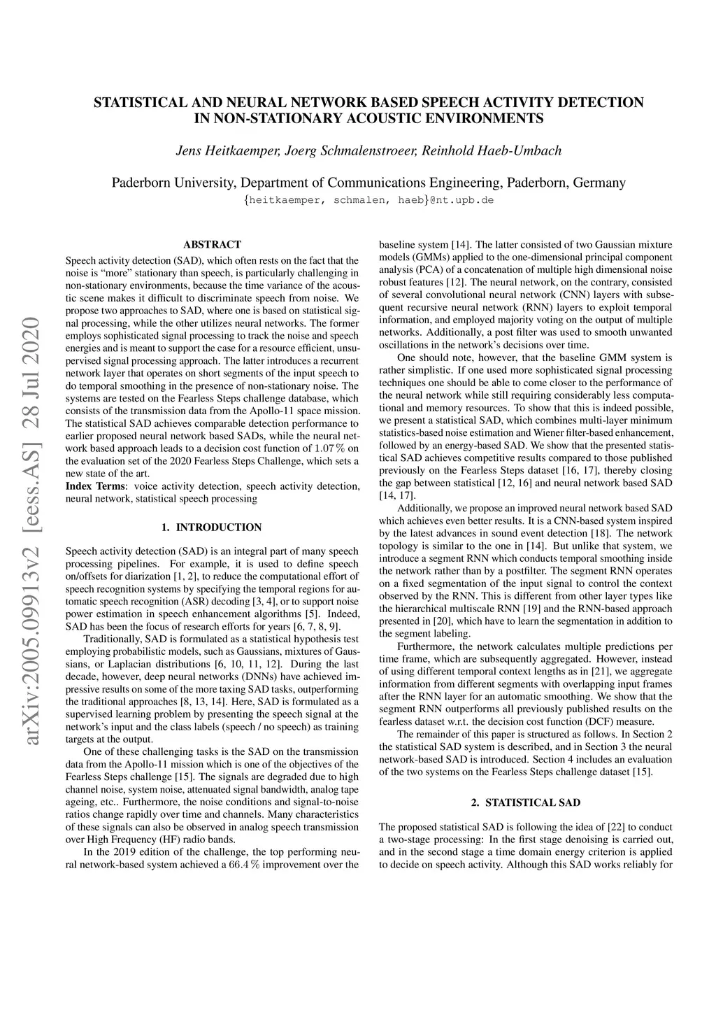 Speech activity detection (SAD), which often rests on the fact that the noise is "more" stationary than speech, is particularly challenging in non-stationary environments, because the time variance of the acoustic scene makes it difficult to discriminate speech from noise. We propose two approaches to SAD, where one is based on statistical signal processing, while the other utilizes neural networks. The former employes sophisticated signal processing to track the noise and speech energies and is meant to support the case for a resource efficient, unsupervised signal processing approach. The latter introduces a recurrent network layer that operates on short segments of the input speech to do temporal smoothing in the presence of non-stationary noise. The systems are tested on the Fearless Steps challenge, which consists of the transmission data from the Apollo-11 space mission. The statistical SAD achieves comparable detection performance to earlier proposed neural network based SADs, while the neural network based approach leads to a decision cost function of 1.07% on the evaluation set of the 2020 Fearless Steps Challenge, which sets a new state of the art.