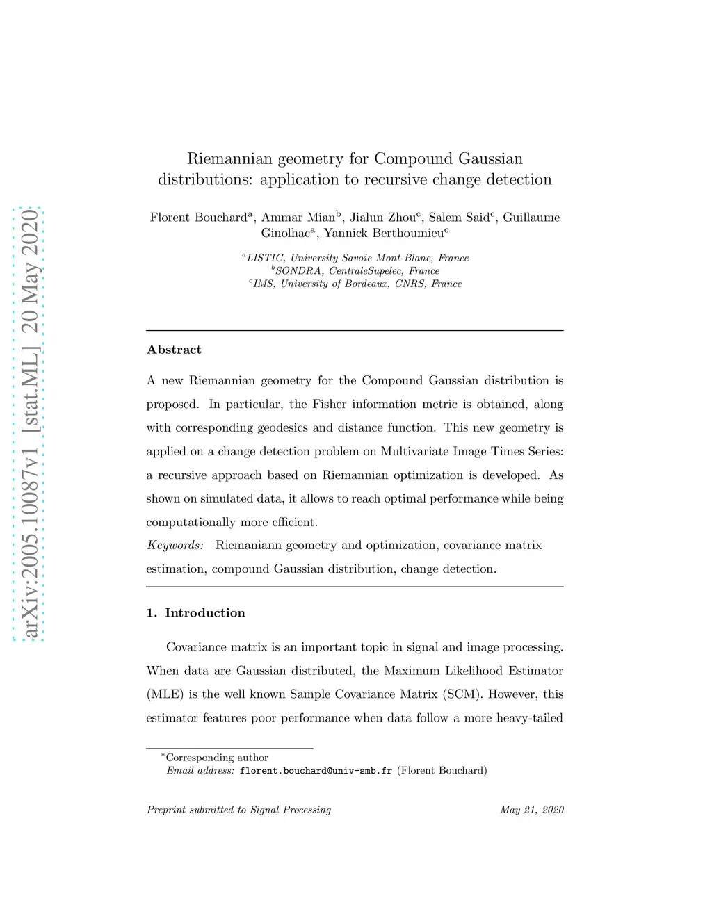 A new Riemannian geometry for the Compound Gaussian distribution is proposed. In particular, the Fisher information metric is obtained, along with corresponding geodesics and distance function. This new geometry is applied on a change detection problem on Multivariate Image Times Series: a recursive approach based on Riemannian optimization is developed. As shown on simulated data, it allows to reach optimal performance while being computationally more efficient.