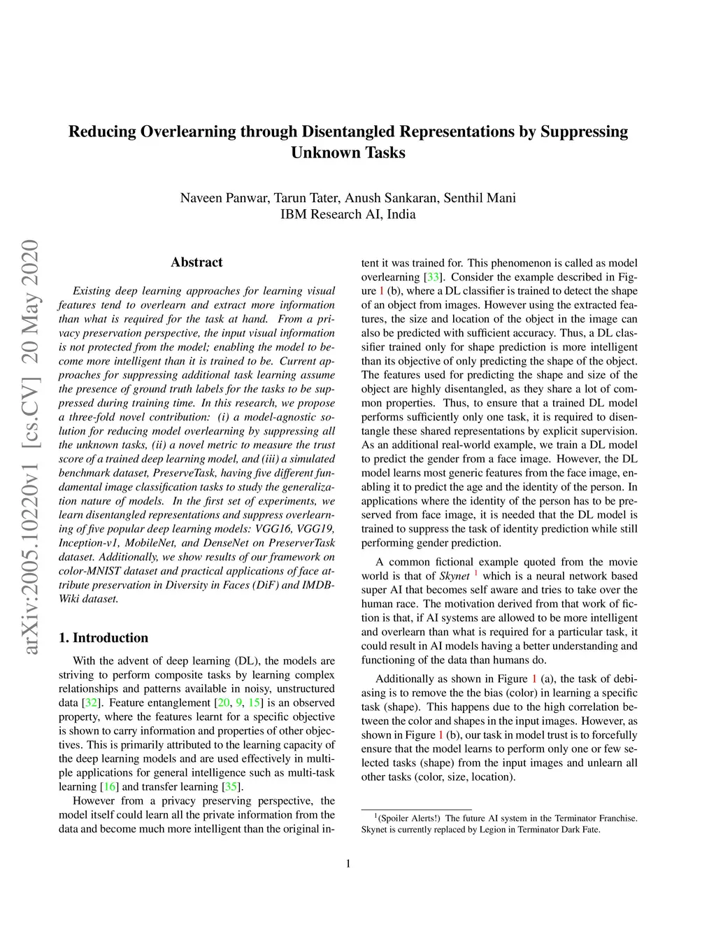 Existing deep learning approaches for learning visual features tend to overlearn and extract more information than what is required for the task at hand. From a privacy preservation perspective, the input visual information is not protected from the model; enabling the model to become more intelligent than it is trained to be. Current approaches for suppressing additional task learning assume the presence of ground truth labels for the tasks to be suppressed during training time. In this research, we propose a three-fold novel contribution: (i) a model-agnostic solution for reducing model overlearning by suppressing all the unknown tasks, (ii) a novel metric to measure the trust score of a trained deep learning model, and (iii) a simulated benchmark dataset, PreserveTask, having five different fundamental image classification tasks to study the generalization nature of models. In the first set of experiments, we learn disentangled representations and suppress overlearning of five popular deep learning models: VGG16, VGG19, Inception-v1, MobileNet, and DenseNet on PreserverTask dataset. Additionally, we show results of our framework on color-MNIST dataset and practical applications of face attribute preservation in Diversity in Faces (DiF) and IMDB-Wiki dataset.