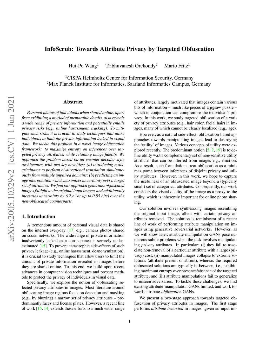 Personal photos of individuals when shared online, apart from exhibiting a myriad of memorable details, also reveals a wide range of private information and potentially entails privacy risks (e.g., online harassment, tracking). To mitigate such risks, it is crucial to study techniques that allow individuals to limit the private information leaked in visual data. We tackle this problem in a novel image obfuscation framework: to maximize entropy on inferences over targeted privacy attributes, while retaining image fidelity. We approach the problem based on an encoder-decoder style architecture, with two key novelties: (a) introducing a discriminator to perform bi-directional translation simultaneously from multiple unpaired domains; (b) predicting an image interpolation which maximizes uncertainty over a target set of attributes. We find our approach generates obfuscated images faithful to the original input images, and additionally increase uncertainty by 6.2 (or up to 0.85 bits) over the non-obfuscated counterparts.