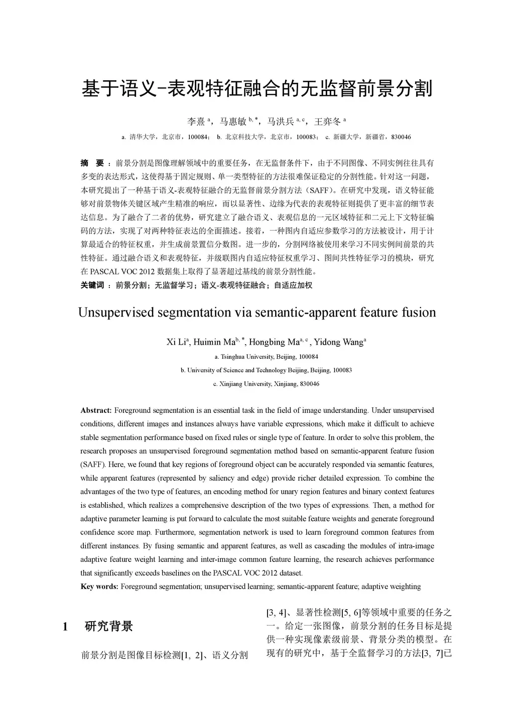Foreground segmentation is an essential task in the field of image understanding. Under unsupervised conditions, different images and instances always have variable expressions, which make it difficult to achieve stable segmentation performance based on fixed rules or single type of feature. In order to solve this problem, the research proposes an unsupervised foreground segmentation method based on semantic-apparent feature fusion (SAFF). Here, we found that key regions of foreground object can be accurately responded via semantic features, while apparent features (represented by saliency and edge) provide richer detailed expression. To combine the advantages of the two type of features, an encoding method for unary region features and binary context features is established, which realizes a comprehensive description of the two types of expressions. Then, a method for adaptive parameter learning is put forward to calculate the most suitable feature weights and generate foreground confidence score map. Furthermore, segmentation network is used to learn foreground common features from different instances. By fusing semantic and apparent features, as well as cascading the modules of intra-image adaptive feature weight learning and inter-image common feature learning, the research achieves performance that significantly exceeds baselines on the PASCAL VOC 2012 dataset.