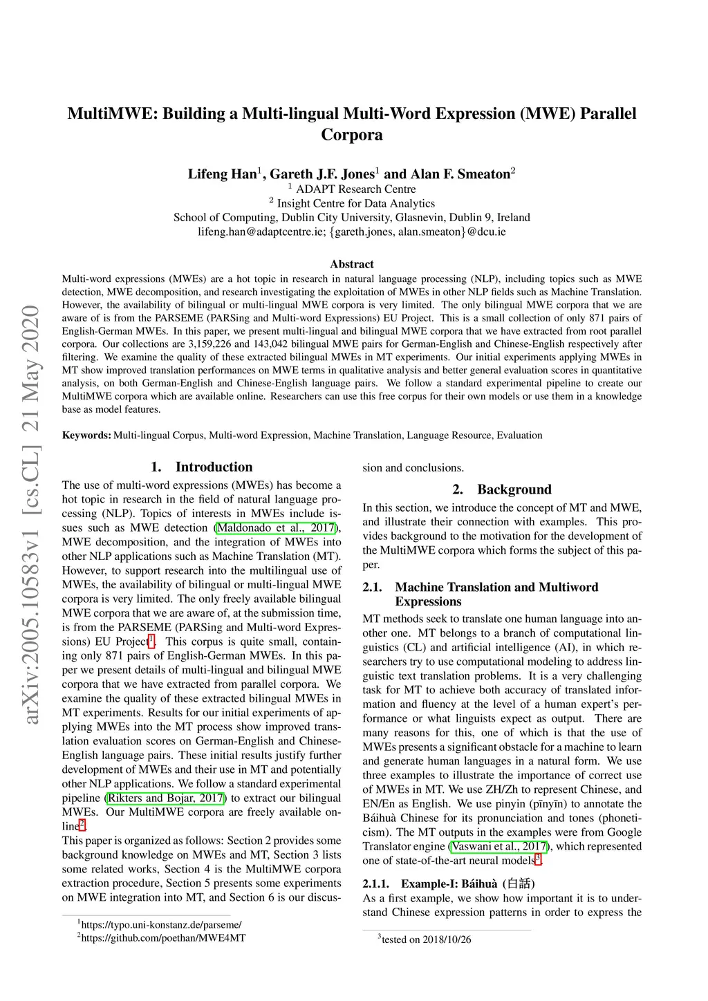 Multi-word expressions (MWEs) are a hot topic in research in natural language processing (NLP), including topics such as MWE detection, MWE decomposition, and research investigating the exploitation of MWEs in other NLP fields such as Machine Translation. However, the availability of bilingual or multi-lingual MWE corpora is very limited. The only bilingual MWE corpora that we are aware of is from the PARSEME (PARSing and Multi-word Expressions) EU Project. This is a small collection of only 871 pairs of English-German MWEs. In this paper, we present multi-lingual and bilingual MWE corpora that we have extracted from root parallel corpora. Our collections are 3,159,226 and 143,042 bilingual MWE pairs for German-English and Chinese-English respectively after filtering. We examine the quality of these extracted bilingual MWEs in MT experiments. Our initial experiments applying MWEs in MT show improved translation performances on MWE terms in qualitative analysis and better general evaluation scores in quantitative analysis, on both German-English and Chinese-English language pairs. We follow a standard experimental pipeline to create our MultiMWE corpora which are available online. Researchers can use this free corpus for their own models or use them in a knowledge base as model features.