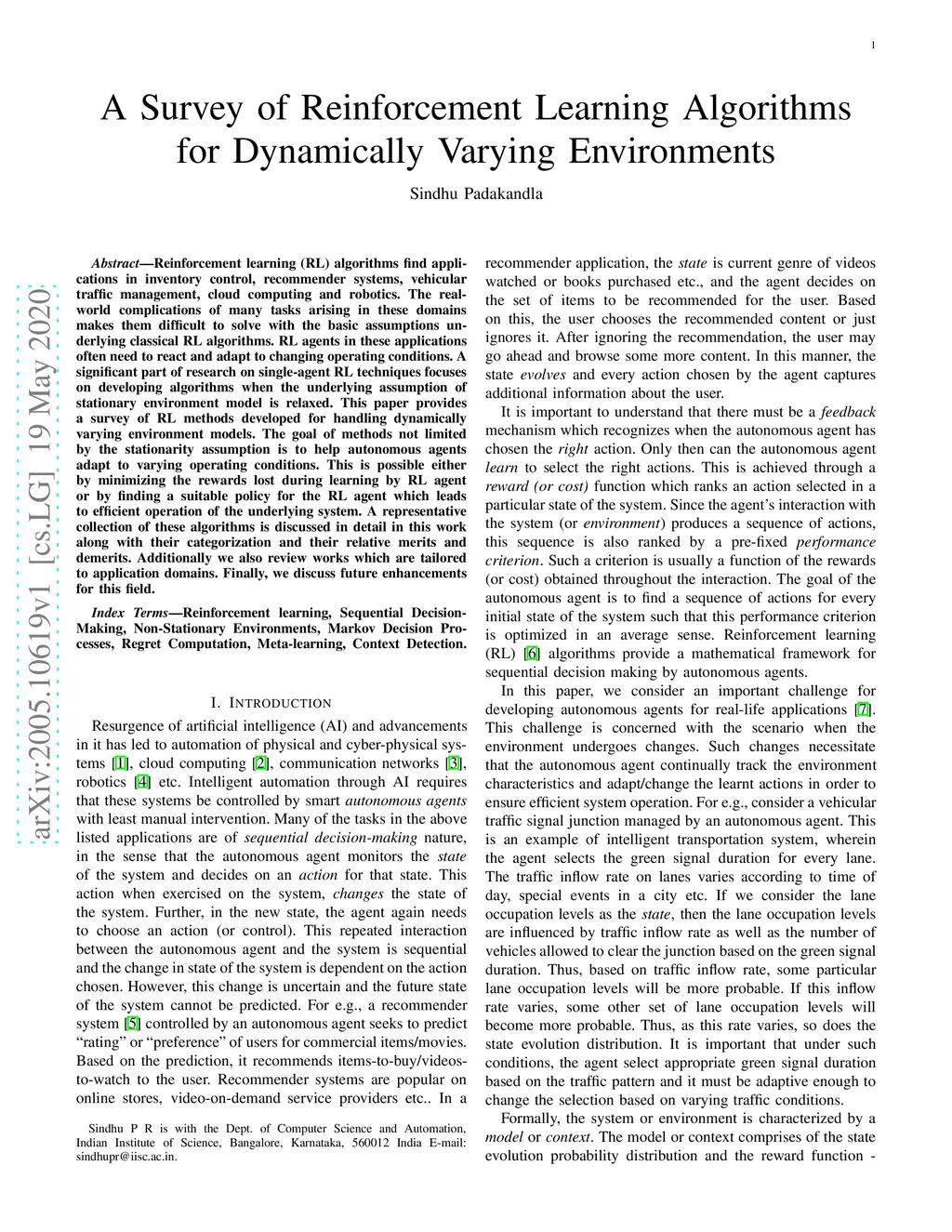 A Survey of Reinforcement Learning Algorithms for Dynamically Varying