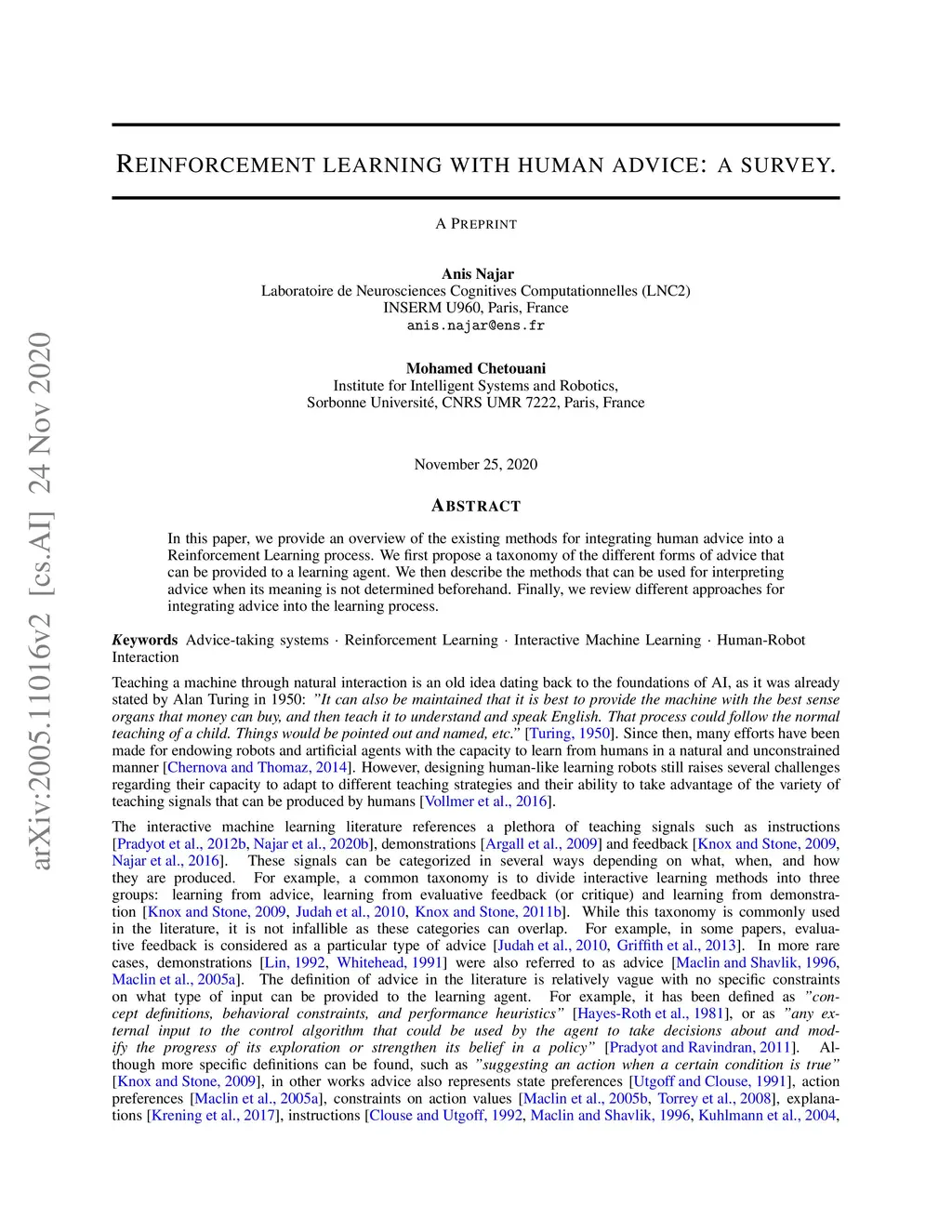In this paper, we provide an overview of the existing methods for integrating human advice into a Reinforcement Learning process. We first propose a taxonomy of the different forms of advice that can be provided to a learning agent. We then describe the methods that can be used for interpreting advice when its meaning is not determined beforehand. Finally, we review different approaches for integrating advice into the learning process.